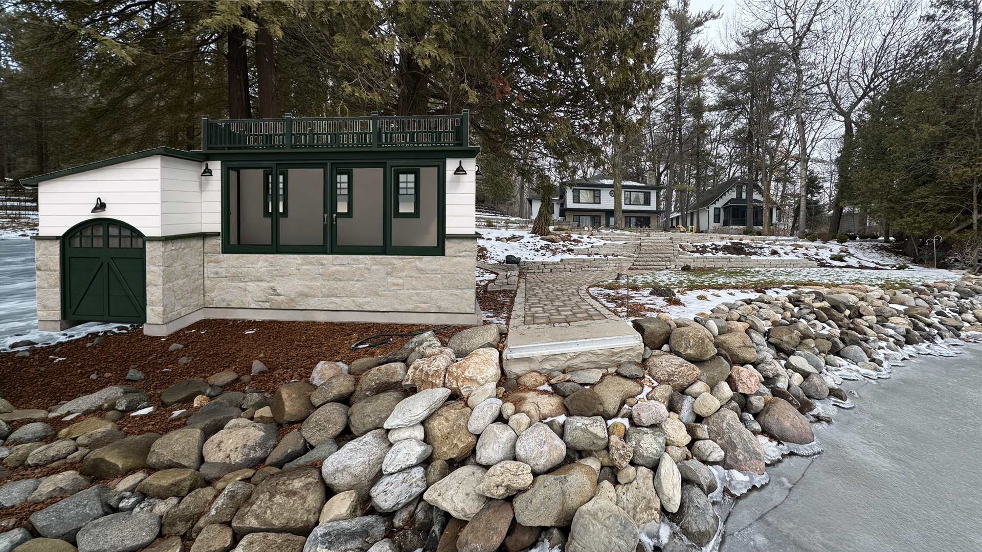 make boathouse and house in background facing the same direction summertime add landscaping around boathouse