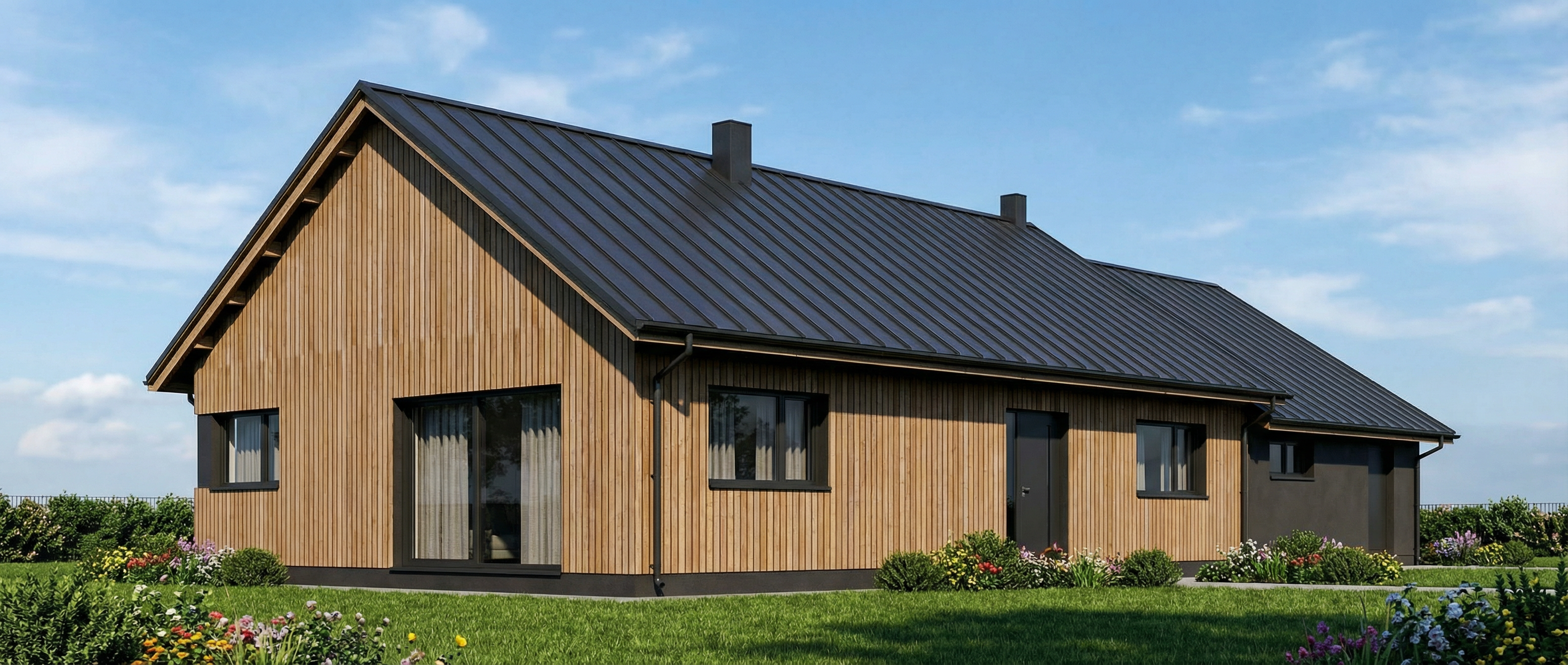 metal dark roof wooden walls dark plaster dark windows and door courtins in windows low bushes and flowers chimney covered with dark sheet metal