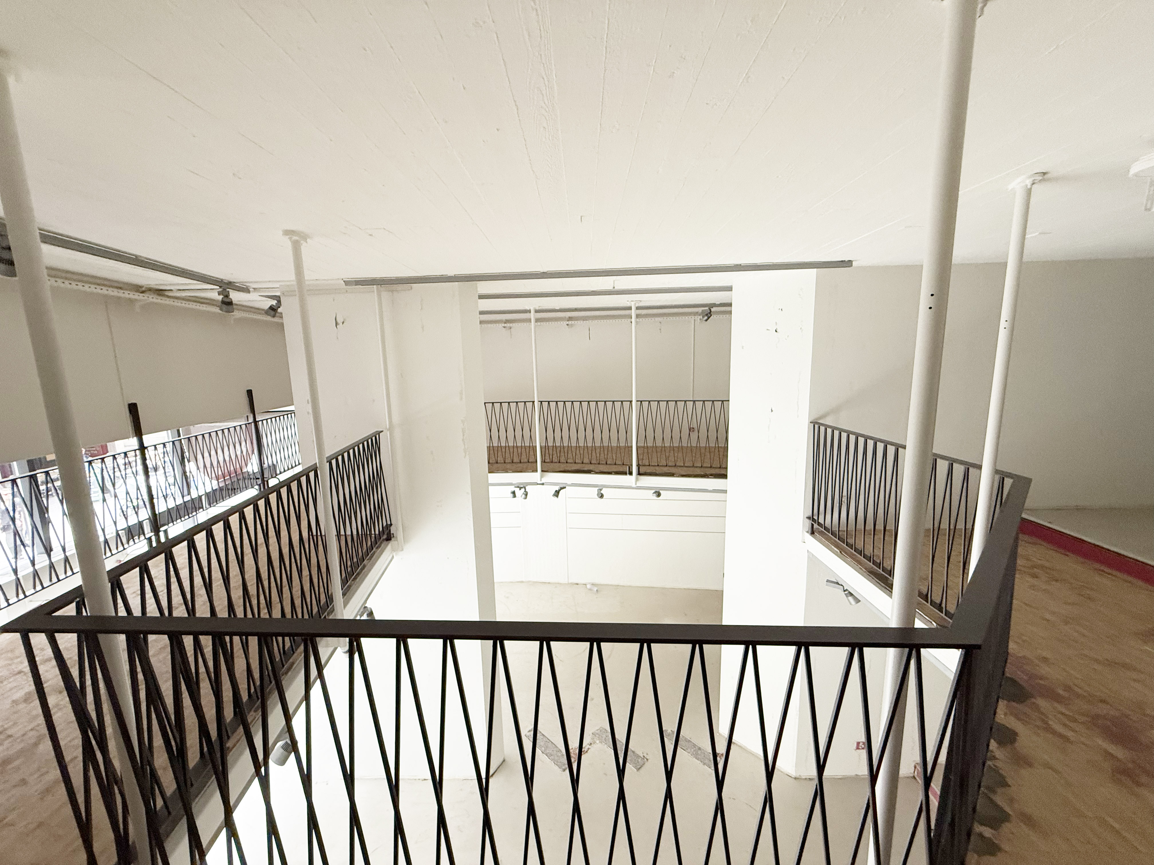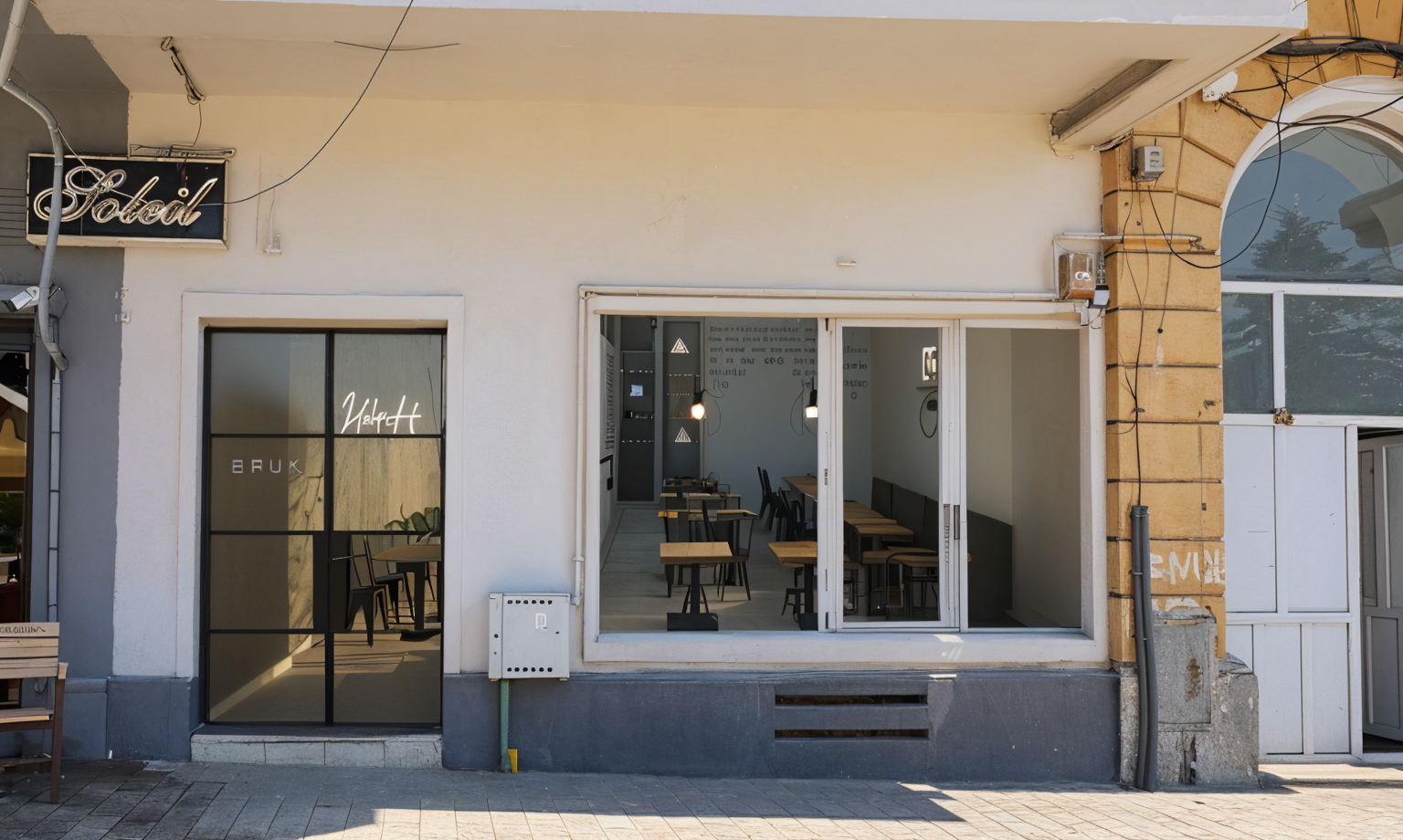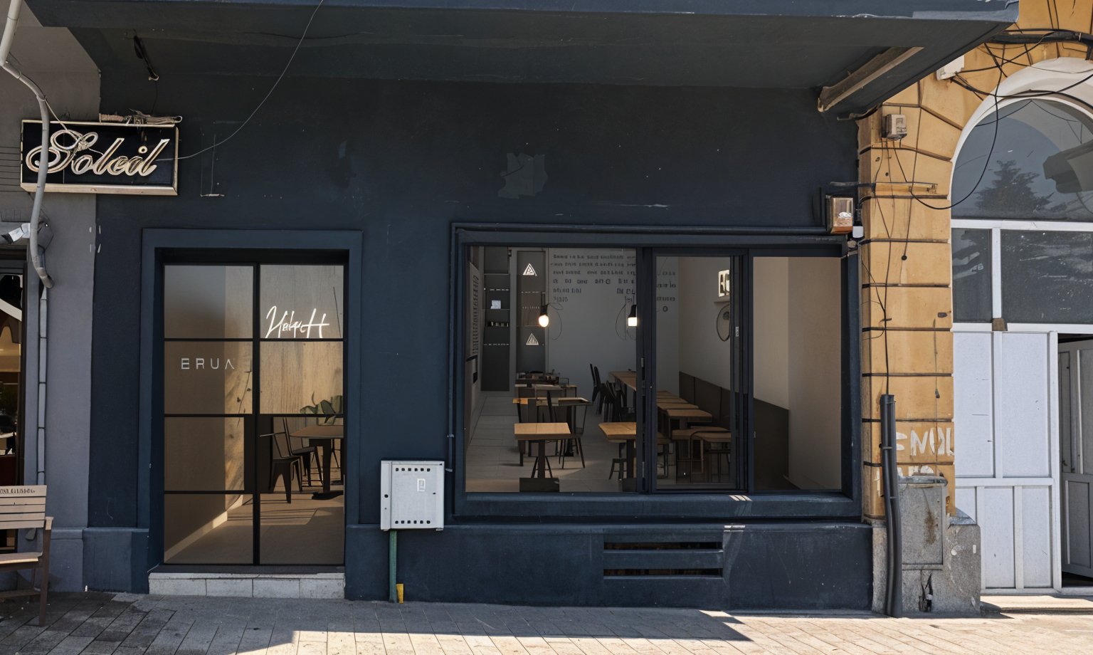 erstelle eine restaurant mit tischen um das gel nder die decke in anthrazit architecture