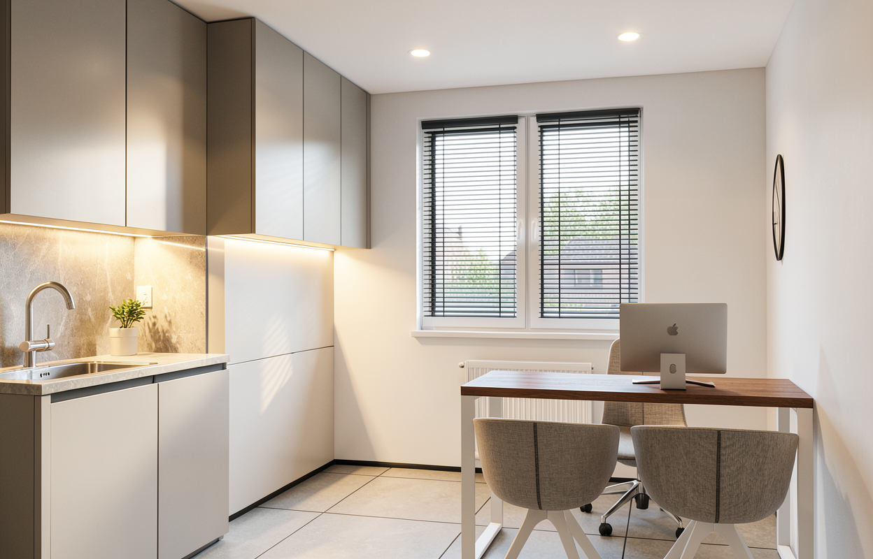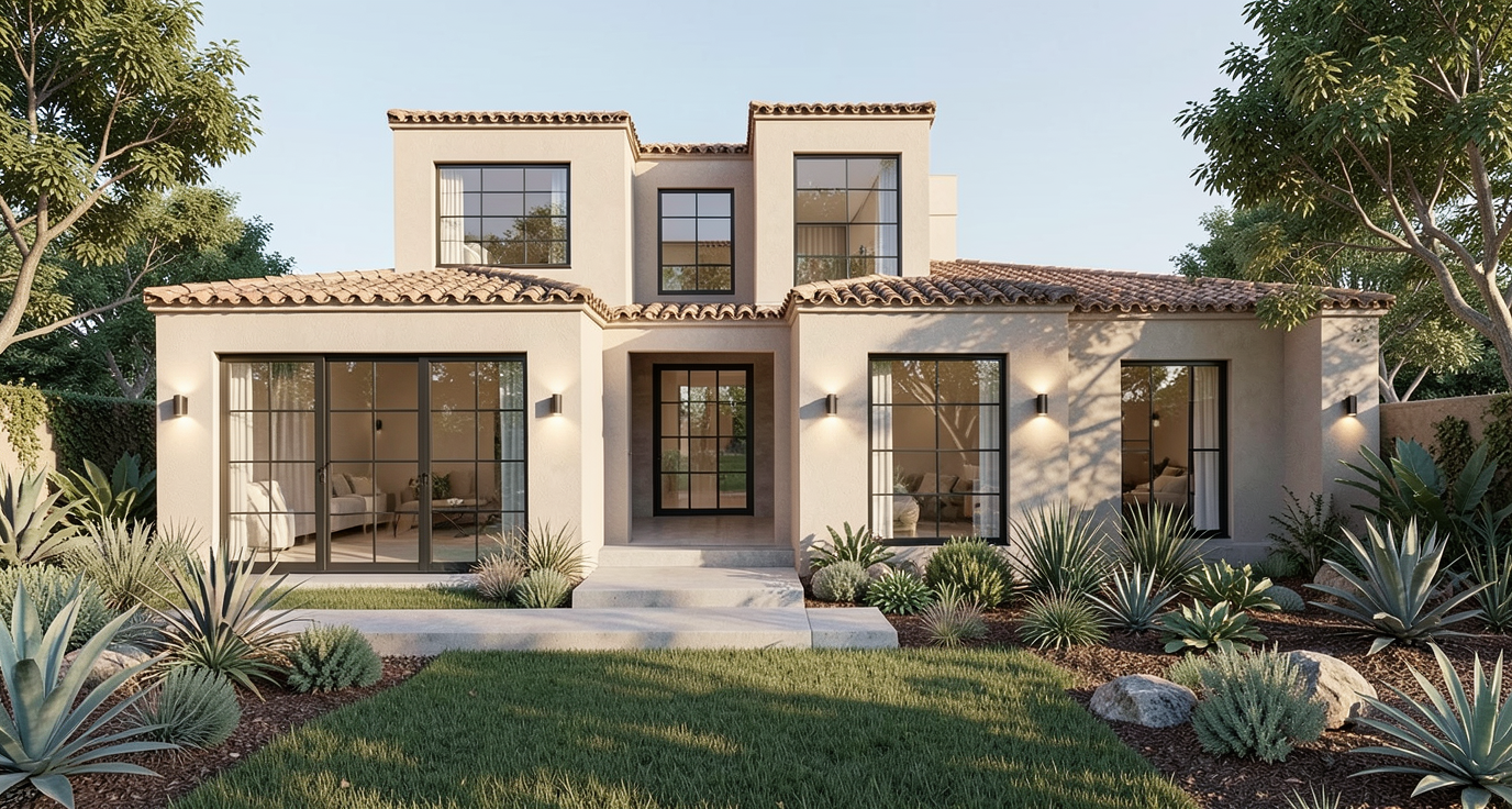 create an adobe style enganced version of this structure with drought resistant lanscaping real roof tile detail and smoothe stucco texture add exterior light sconces on each side of the windows and sliding doors and create a modern organic feel to the image maintain the exact dimensions and layout from the original image darker stucco color almost charcoal add perimeter hedge fence 10 feet away from the right side and 5 feet away from the left side and remove all lawn and only landcape with drought resistant landscaping like gravel cactuses olive trees