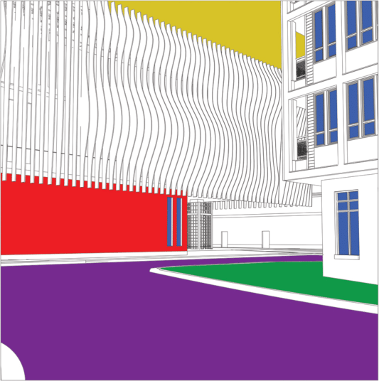 render to a photo realistic quality the organic flaps are meant to look like wood the red is a staggered stone facade the blue is reflective glass the green is green space below the building purple is a nearby road and yellow is the sky generate lights behind the facade flaps