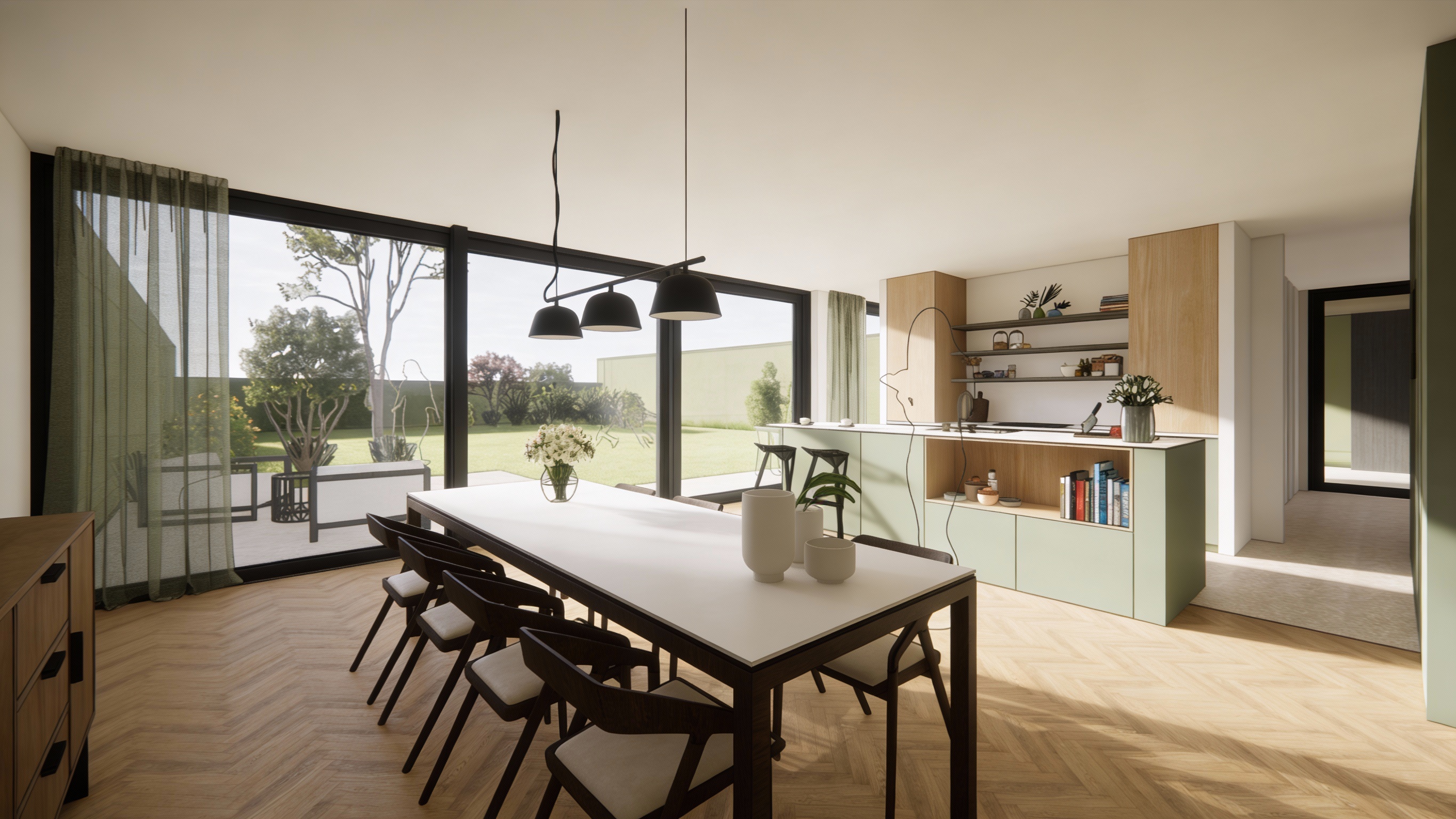 afternoon view add los angeles drought landscape around the house keep the perspective view angle from the source image add a woman walking on the corridor at the second level inside glazing mullions anodized aluminum add a man walking at the ground level walking towards the entry