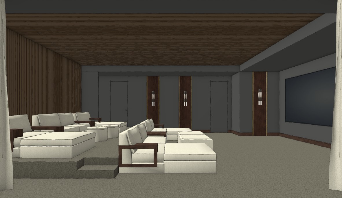 luxury home theater with walnut reeding in on ceiling and wall on left side add very thin soft strip lighting scattered here and there in the reeding brown leather vertical panels on walls with this exact sconce soft glow from the sconces dark carpet flooring put a movie on the tv screen showing partially on the right hand side