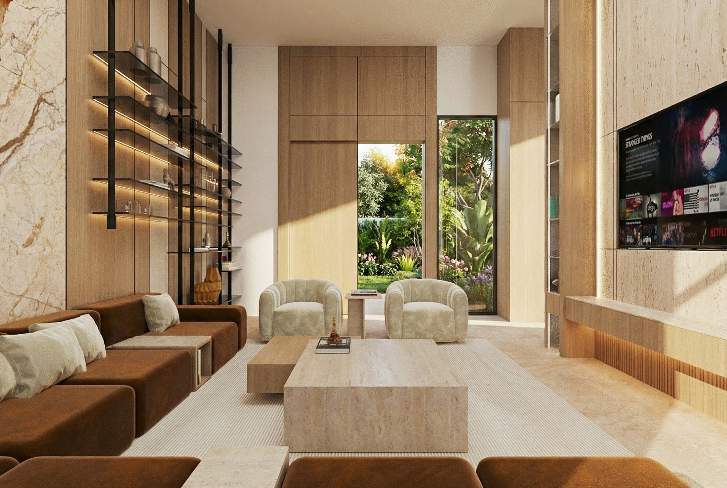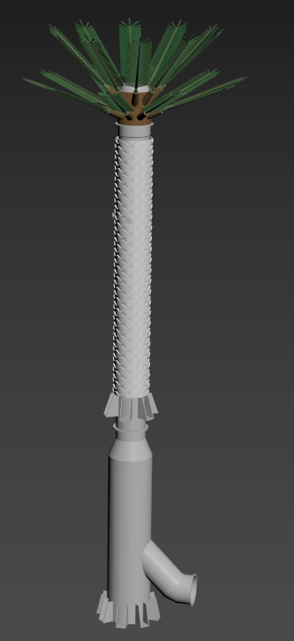 artificial palm tree made of grp architectural render style trunk molded grp in warm medium brown modular diamond bark pattern subtle fiberglass texture semi matte finish soft reflections clean fabricated look crown collar smooth beige grey grp even industrial finish leaves artificial composite fronds in muted green slight tonal variation semi matte minimal translucency uniform but slightly varied spacing lighting soft daylight hdri balanced shadows clean architectural visualization background light sky with soft clouds slight depth of field low angle camera sharp focus slightly rendered aesthetic physically accurate shading not fully natural make the stack the behind column grey grp material and sky real