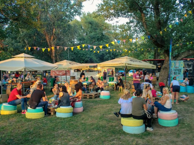 exterior shot generate a picture where there will be seatings and tables made from wheels colored wheels shading elements like the pictures and people eating