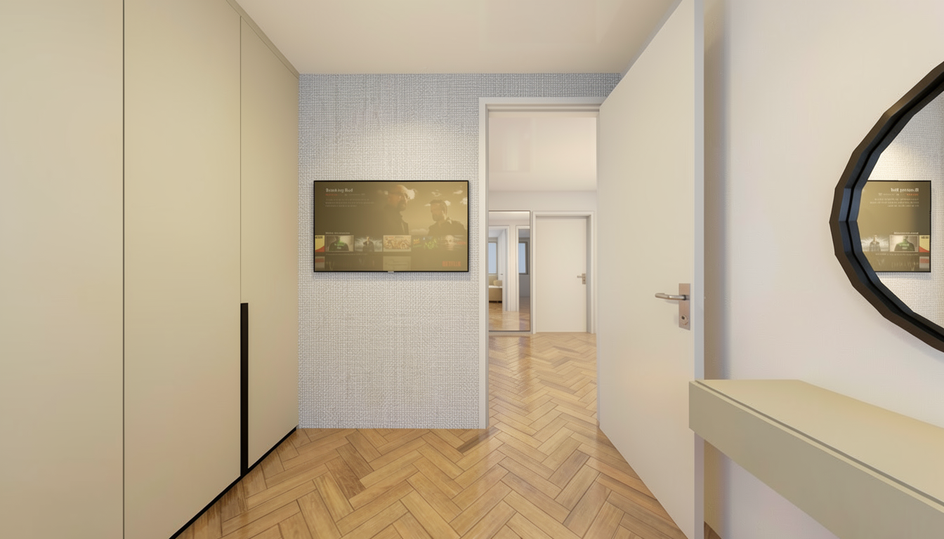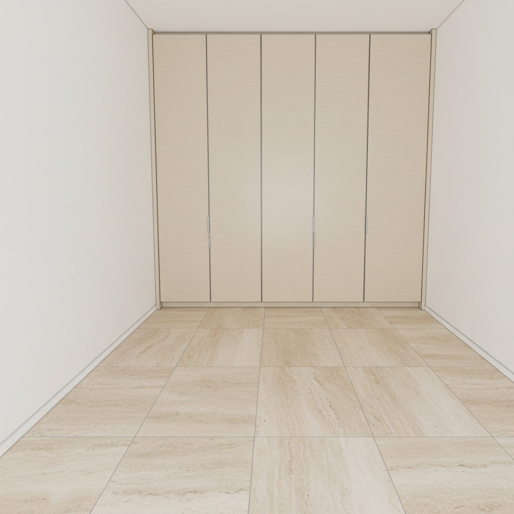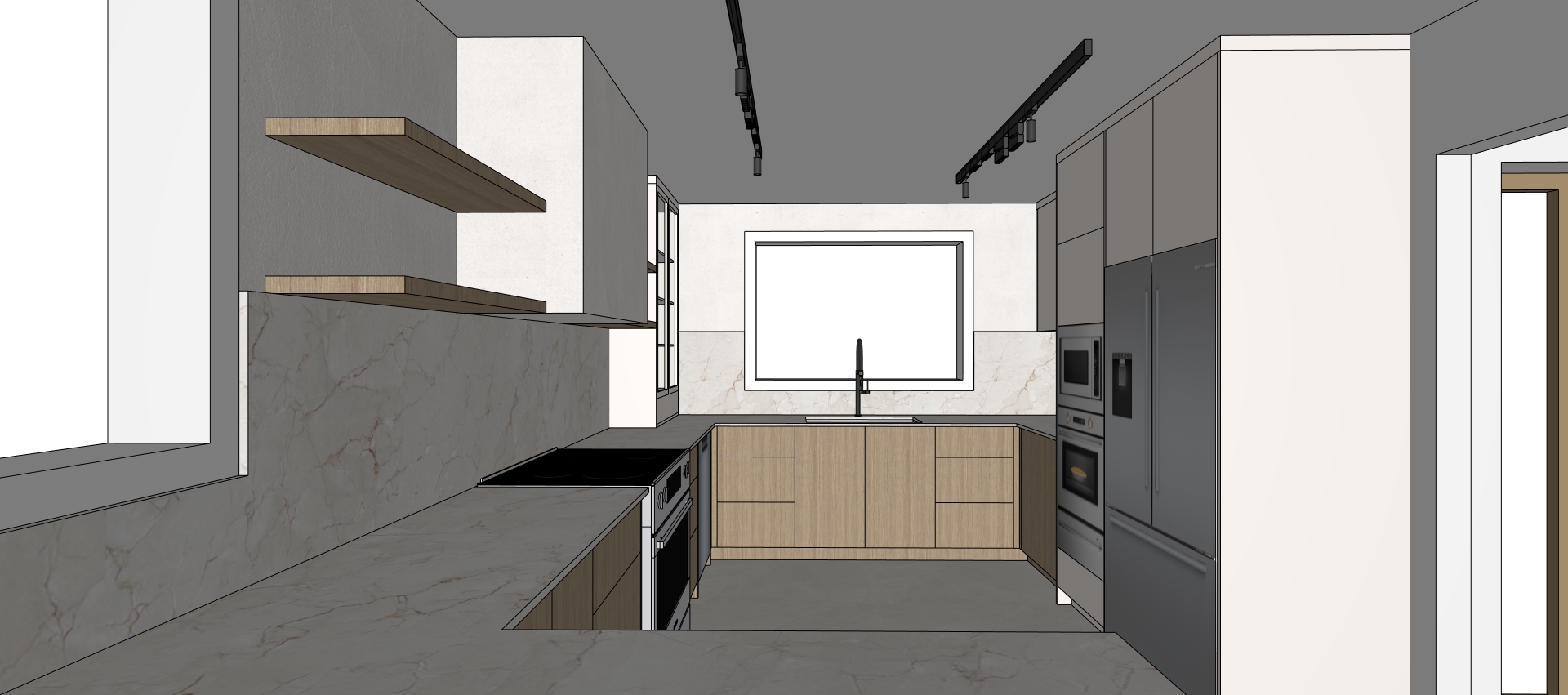 render this japandi style kitchen by adding realistic materials lighting and decorations maintain the structure layout dimension and design of this kitchen walls and insert hood are off white plaster floating shelves and base cabinets are natural oak matte upper and tall cabinets are off white painted mdf with sheen level 50 there are range dishwasher wall microwave oven and french door refrigerator glass cabinet has frosted glass add shelf lightings glass cabinet lightings add modern roman shade in the window in natural linen add minimal decorations like stacked plates planter cook book in japandi style