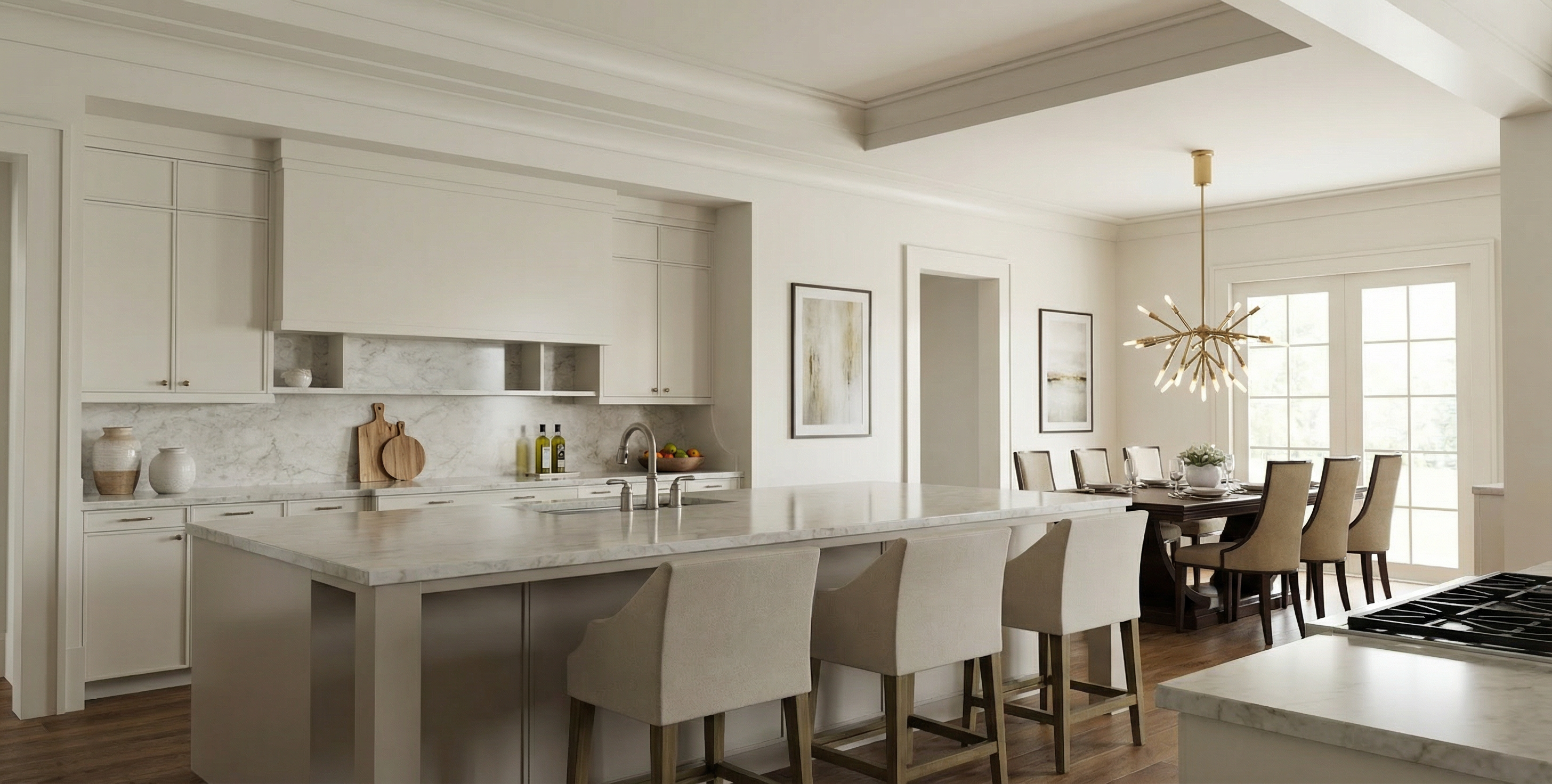 soft off white tones for walls and ceilings medium brown wood floors great lighting kitchen cabinetry to be slightly darker than wall color island to be slightly darker tone than kitchen cabinets add accessories to kitchen counter surface all cabinetry to be painted surfaces elegant and crisp detailing great lighting kitchen island and counters to be lighter colored marble run marble from counter surface to underside of cabinetry all painted cabinetry add artwork on open wall surface