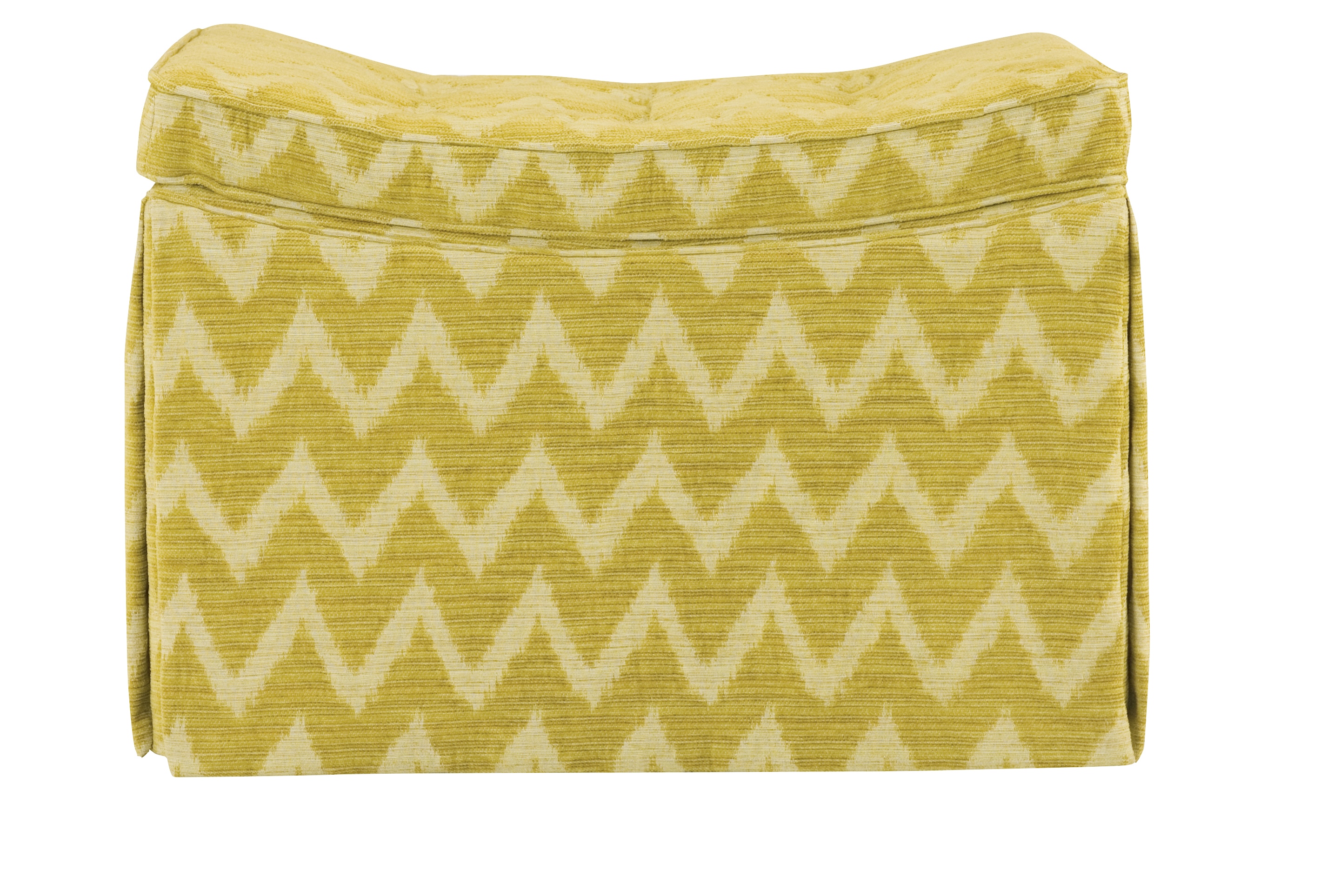 exterior shot the ottman is 27 5 long 18 5 deep and 20 high it is upholstered in a sage green and white thin pinstripe fabric with self welt the stripes in the pinstripe pattern are 1 8 thick