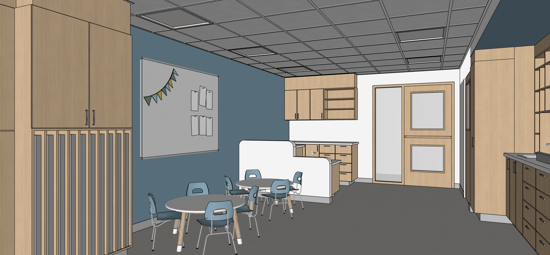 photorealistic architectural interior render of a childcare center cpe based strictly on the provided sketchup image do not add remove or modify any architectural elements furniture openings or layout keep all objects proportions and positions exactly as modeled all existing ceiling light fixtures must be turned on and emit soft realistic illumination combine artificial lighting with natural light if present keeping a balanced and believable exposure preserve the original colors and materials but enhance them with realistic textures accurate material properties and subtle imperfections soft wood grain fabric softness matte finishes child friendly clean calm and warm atmosphere suitable for a cpe environment realistic global illumination soft shadows correct scale neutral camera perspective no dramatic effects no stylization no artistic interpretation ultra realistic architectural visualization professional quality natural color grading no new furniture no extra decor no change in layout no change in wall positions no change in ceiling design no natural light from the doors glasses interior door all walls and ceiling must remain their orginal colorsdo not add new light fixture in the furniture