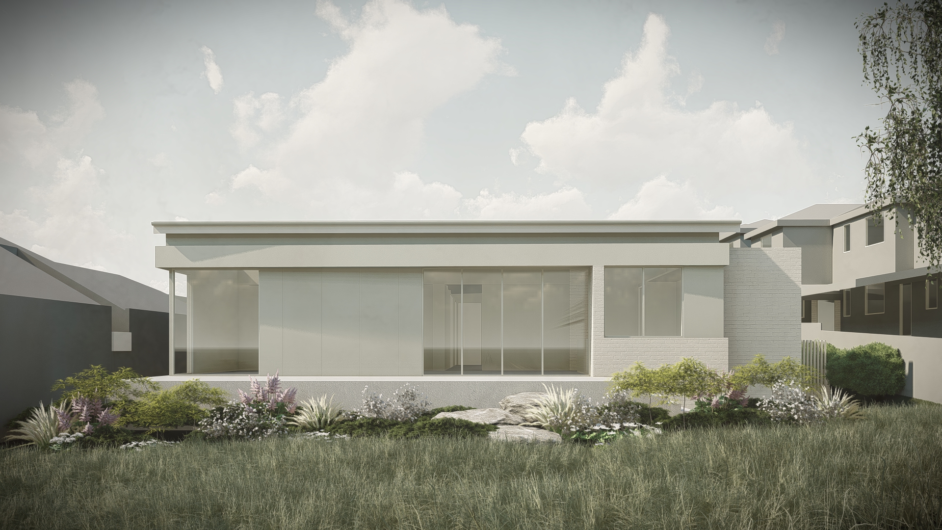 photorealistic architectural rendering of a contemporary australian rural home enhancing an existing lumion base image introduce soft atmospheric depth abundant natural light with a warm low angle sun early morning or late afternoon creating gentle highlights and soft shadows the front of the building needs direct sunlight on an oblique angle refine materiality to feel tactile and true to life cement sheet to be smooth paint finish stone with natural irregularity and depth brick to be painted white metal with subtle reflectivity and imperfections glazing with realistic reflections and slight interior transparency add understated warm interior lighting 2700k 3000k to create a soft glow ensuring it feels natural and not overexposed balance interior and exterior lighting so neither dominates enhance landscaping with slight movement and realism softened edges and subtle tonal variation in grasses and foliage introduce light environmental effects e g faint haze diffused background to increase depth and atmosphere overall mood should be warm calm and evocative slightly ethereal but grounded in realism avoid overly dramatic contrast or stylisation aim for a premium architectural photography aesthetic with a cinematic softness