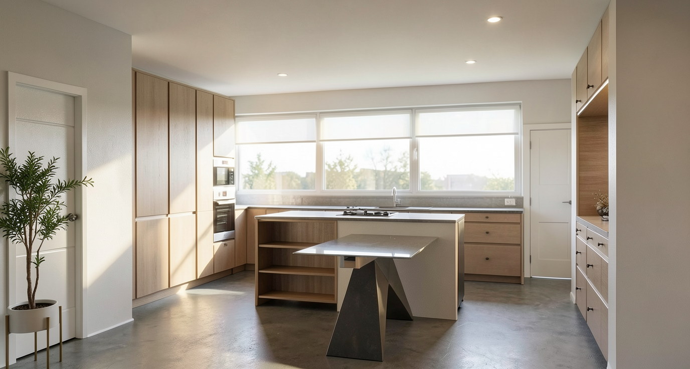 crea una imagen fotorealista en base a este sketchup realza texturas e iluminacion al fondo a la derecha hay una puerta de color balnco los muebles columna son lacados en beige a ade algo de decoracion para la cocina cuidado has tapado una ventana