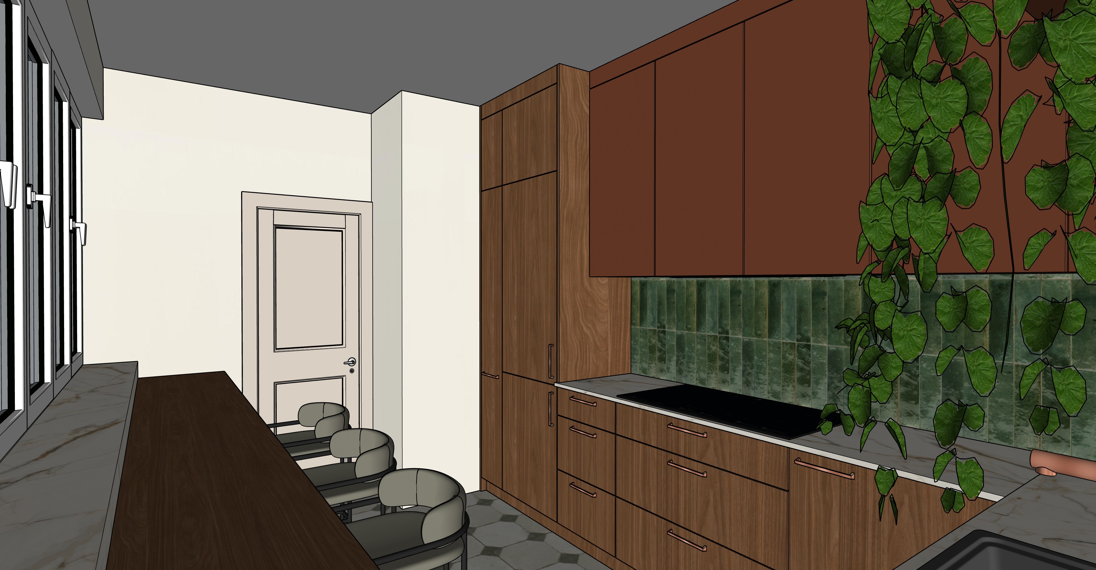 prompt photorealistic architectural visualization of a luxury historical villa kitchen composition strict 1 1 perspective matching the provided architectural wireframe eye level view no camera distortion materials upper wall cabinets in flat matte terracotta brick orange finish no wood grain tall pantry units and lower cabinets in premium dark walnut wood with vertical grain backsplash made of glossy forest green zellige tiles with handcrafted irregular textures and shimmering reflections countertops and deep windowsills in white carrara marble with subtle grey veining furniture exactly three bar stools with light green fabric upholstery and copper frames background a closed flat panel door in matte light beige finish lighting soft natural daylight through large white framed windows integrated warm led strips only under the wall cabinets and above the shelf strictly no plinth toe kick lighting details copper brushed brass hardware and faucet induction hob positioned under terracotta cabinets sink in the foreground large hanging green ivy plant on the right atmosphere contemporary art deco high end 8k resolution cinematic lighting ray traced reflections octane render style through the window a blurry view of a historical manor garden with old growth trees kluczowe parametry stylu dla archsync settings style preference contemporary classic modern art deco material preset pbr physically based rendering marble walnut glossy ceramic matte lacquer lighting mode exterior daylight interior artificial accent render quality ultra high res prompt strength cgf scale 7 5 8 5 aby trzyma si opisu ale pozwoli na realizm tekstur