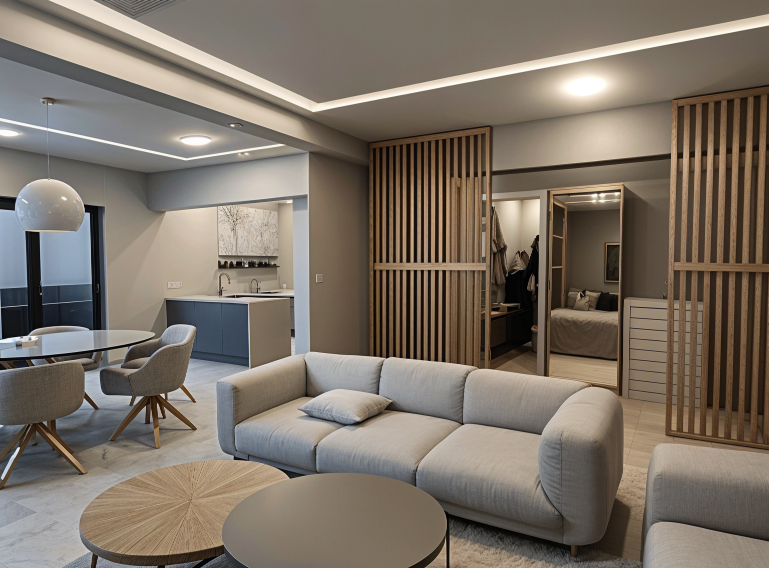 preserve all geometry lighting colors add an abstract painting on the right wall add 4 cups and a pitcher to the shelves on the left and a sink to the countertop to the left make the floor and ceiling hardwood boards that run from left to right in a medium brown