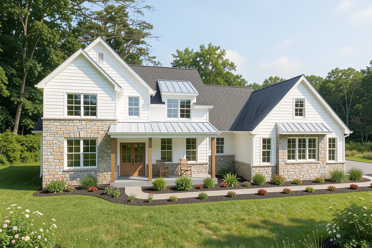 here is your full prompt ready to paste create a photorealistic 3d front exterior elevation rendering of a two storey single family home with an attached garage match the following exact design and finishes overall form structure two storey home with a wide front face upper floor is slightly wider forward than the main floor creating a subtle cantilever bump out effect the center section of the upper floor spanning the middle two windows projects forward as a bump out with its own vertical siding creating a box bay style projection main floor has the garage taking up the majority of the front face with the front entry on the far right hip roof slopes on all four sides not a gable roof precast concrete steps at the front entry on the far right roof hip pyramid style roof with a low to medium pitch matte black asphalt shingles 8 black fascia board running along all rooflines black soffits upper floor windows left to right window 1 36 x50 single window left side set into horizontal siding window 2 36 x60 part of the center bump out projection slightly larger window 3 36 x60 part of the center bump out projection slightly larger matching window 2 window 4 36 x50 single window right side set into horizontal siding window 5 48 x48 far right upper corner smaller square window set into vertical board siding all windows have 6 white window trim casing windows 2 and 3 center bump out project forward from the main wall plane along with the surrounding white vertical vinyl siding exterior siding three distinct zones horizontal vinyl siding marine blue navy blue color covers the main upper floor wall surface on the left and right sections flanking the center bump out also wraps the main floor living area walls where visible vertical vinyl siding board and batten bright white covers only the center bump out projection on the upper floor that pushes forward clean white vertical boards far right upper section white vertical board siding panel beside the 48 x48 window stone masonry glacier white ledgestone stacked stone veneer light white off white natural stone texture applied on the lower main floor portion covers the area between and around the garage doors up to the floor line of the upper level also wraps the front entry surround on the right side stone is glacier white bright white pale grey natural stacked stone not dark or brown garage left and center of front face left stall single door 9 x10 overhead garage door this is an rv garage with a tall 10 foot height door single wide door with horizontal glass insert panels white door center right stall double door 16 x8 overhead garage door standard 8 foot height double wide door horizontal glass insert panels white door both garage doors are white with horizontal glass strip inserts and white frames visible stone veneer surrounds and between the garage doors at the main floor level engineered beam header spanning across the garage opening front entry far right single white front door with sidelite or narrow window beside it white door frame and trim precast concrete steps leading up to the entry small covered entry stoop overhang above the door stone veneer surround around the entry horizontal band floor line a clean horizontal trim band separates the main floor stone from the upper floor marine blue siding white horizontal trim board at the floor line of the upper level acting as a dividing belt course windows main floor small horizontal windows on the left single garage door section part of the rv garage door design entry area has a narrow window beside the front door trim details all window casings and trim white 6 wide fascia black 8 wide all exterior trim boards white garage door frames white setting presentation straight on front elevation view not angled not perspective distorted clear blue sky background green lawn in foreground concrete driveway spanning the full width of the garage bright daylight with soft shadows photorealistic quality not a sketch or illustration