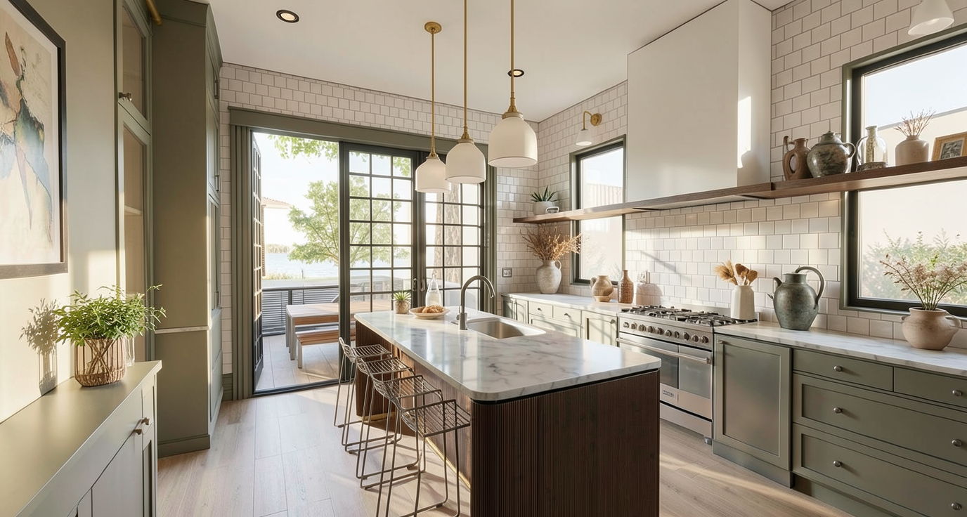 create a realistic rendering of this study room adding details and furnishings plants in the large gray vases and people keep the project as it appears in the original image