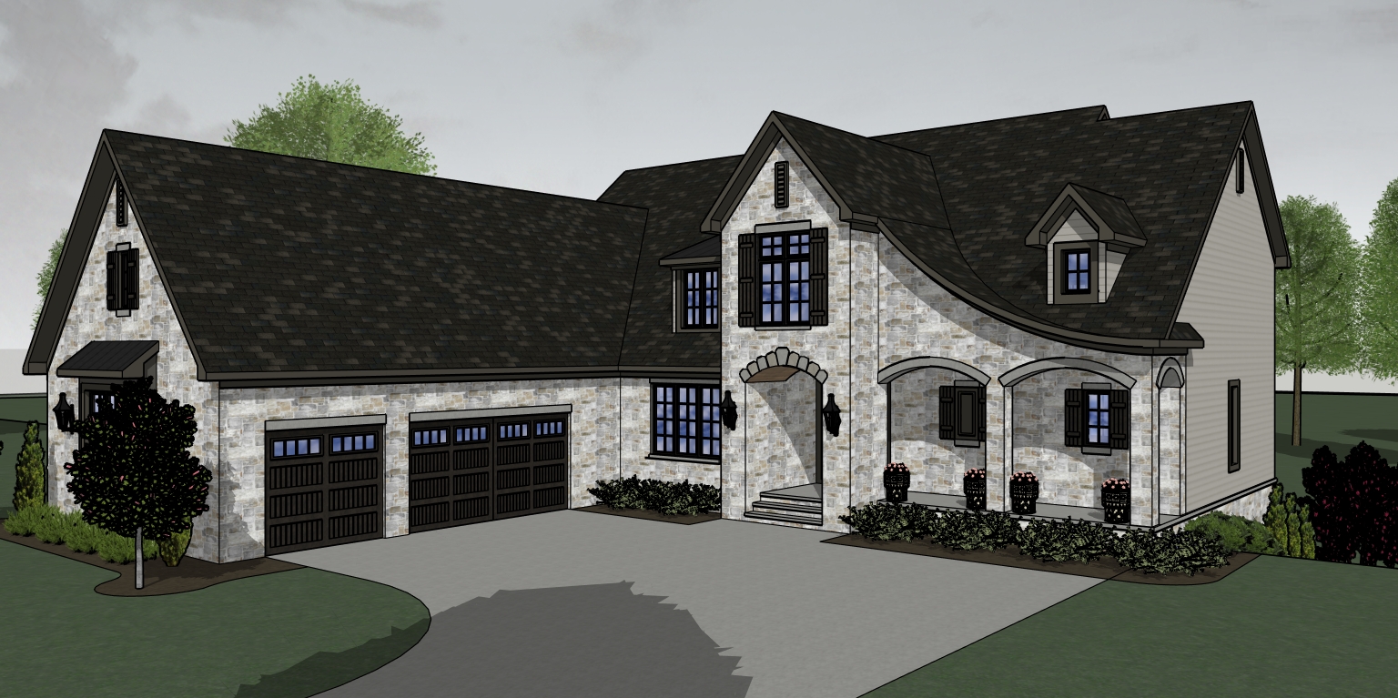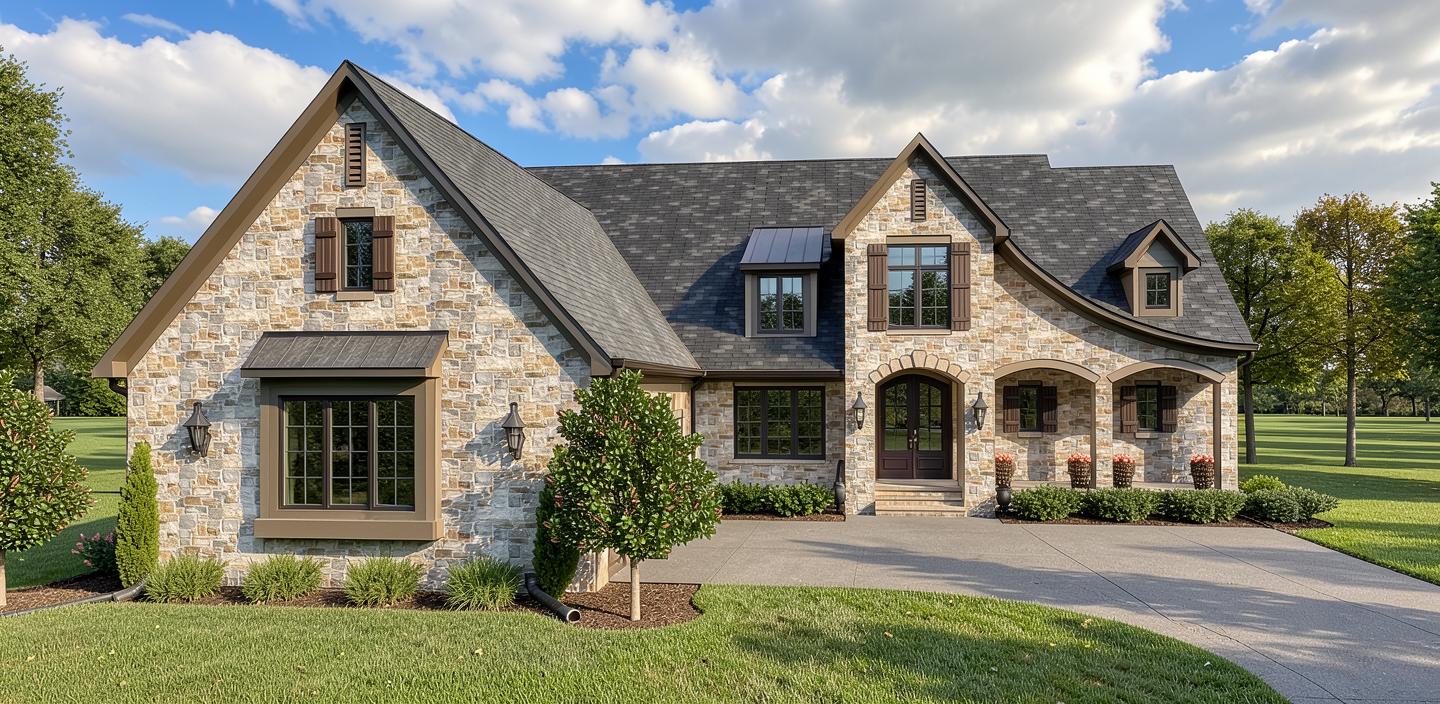 partly cloudy sky some deciduous trees in background add gutters and downspouts