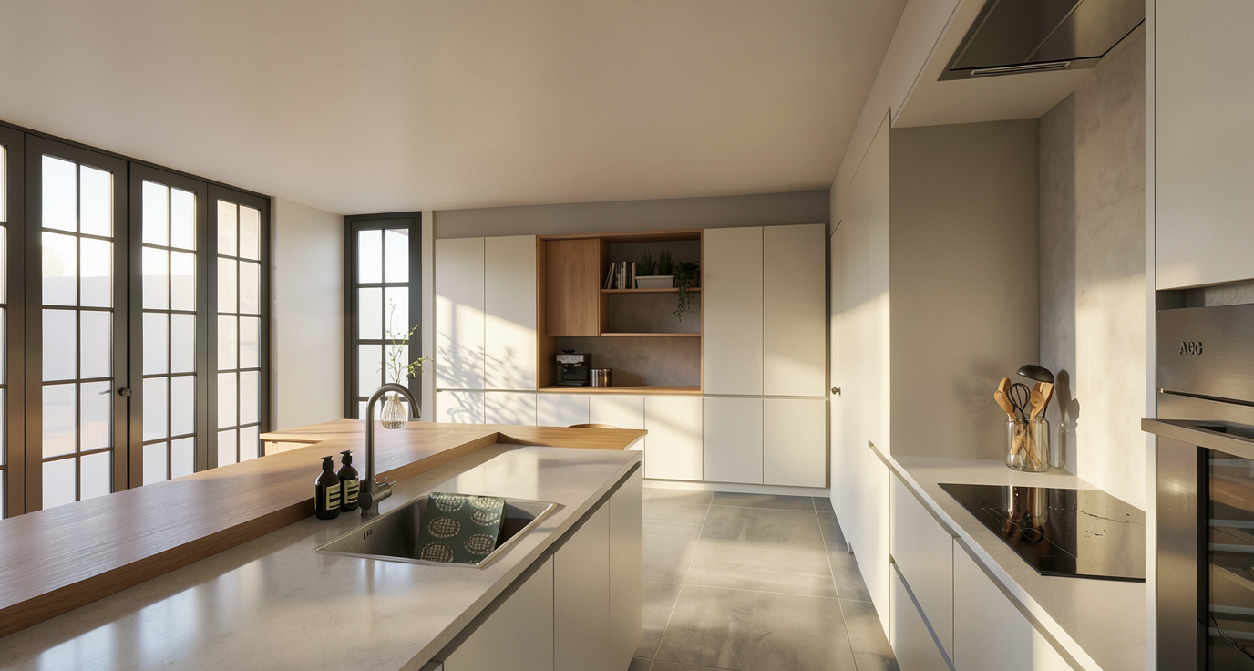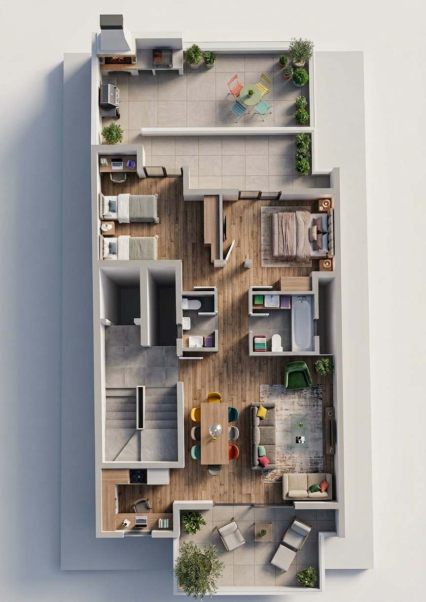 keep everything exactly the same in the rendering do not change the layout walls doors windows shower niche plumbing fixtures wall tile lighting vanity or any materials only change the floor tile size have it match the size on the of the wall tiles do not change the tile material color layout keep everything else exactly the same make the final image look like a realistic photo rendering with natural lighting and soft shadows