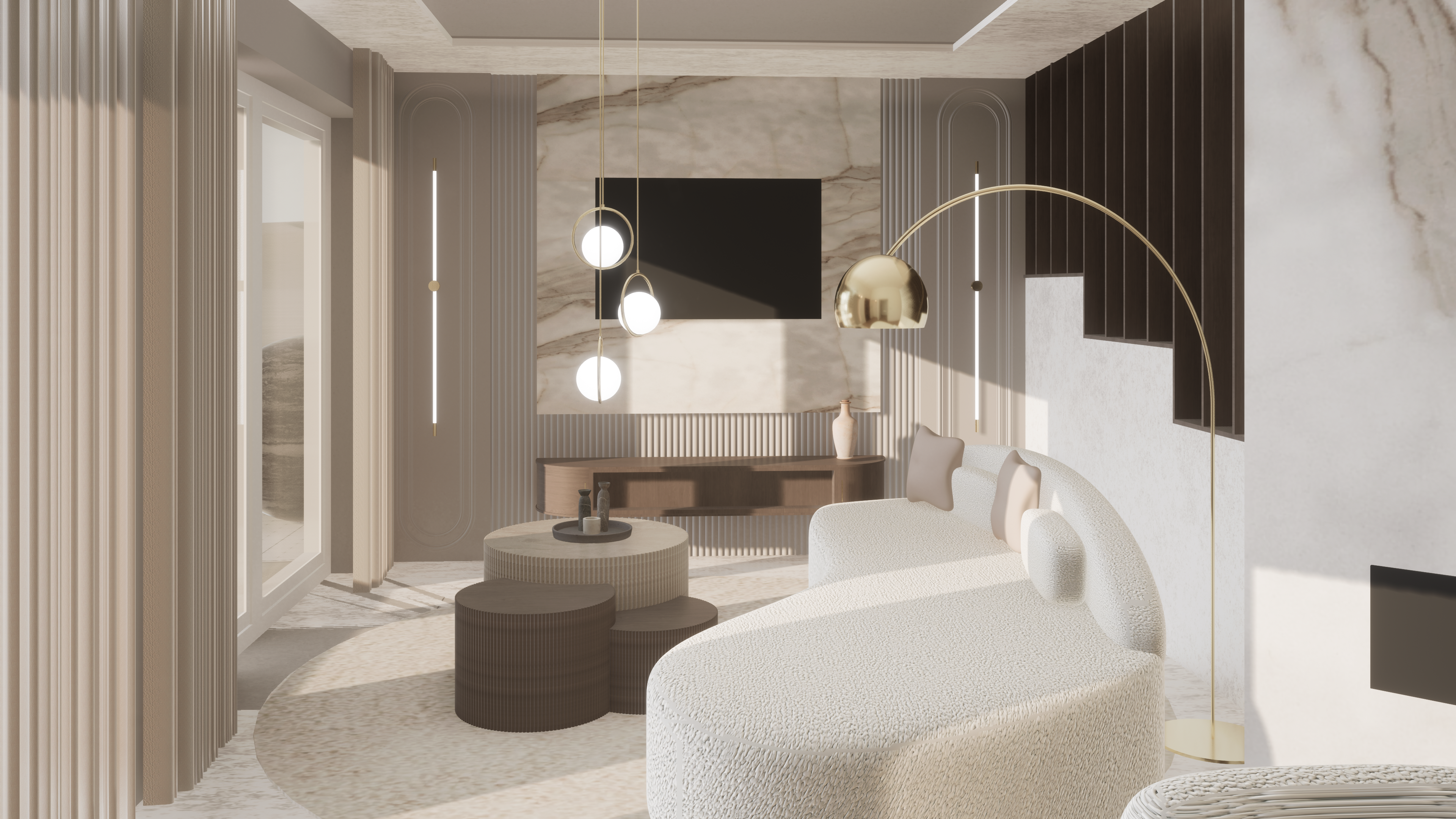interior shot ultra photorealistic rendering in 8k architecture shapes proportions and materials exactly as in the uploaded image keep colors and textures unchanged only depict them more realistically and luxuriously let daylight enter from the left with soft natural shadows all lamps turned on warm elegant light goal maximum material depth photorealistic lighting detailed textures no changes to design or composition architecture