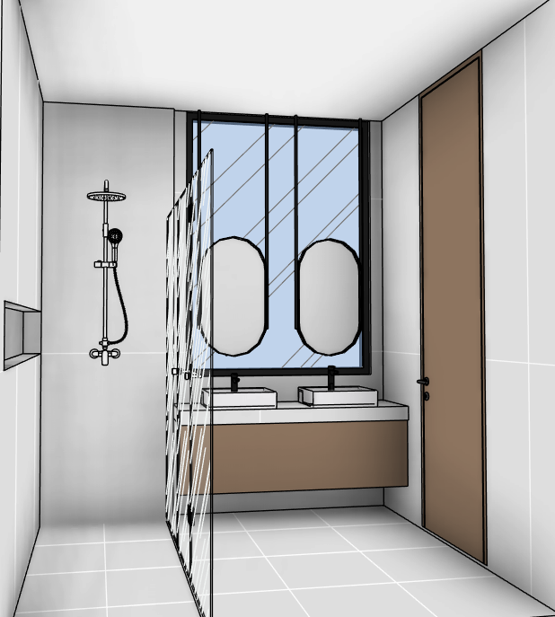 render this revit screenshot into a photorealistic bathroom scene matching the reference image exactly in materials lighting color tone textures and realism keep the geometry from the input image floating vanity with two vessel sinks matte black faucets two oval mirrors frameless shower glass black framed window shower set on left wall and minimal modern layout replace all tile materials to match the reference exactly large format light grey marble tiles with subtle white veining on floor and all walls including the shower wall apply the exact stone texture scale gloss level and soft reflection shown in the reference image the niche shower glass ceiling and grout lines must match the reference use realistic soft natural daylight entering from the window with the same brightness color temperature and shadow softness as the reference apply global illumination soft bounce light and accurate material shading to replicate the reference s overall mood match the reference s details matte black shower fixtures matte black mirror frames white matte vessel sinks with realistic shadows warm natural wood vanity finish floating toilet design if visible ensure the glass refraction ao and micro reflection quality follow the reference exactly camera angle must follow the input image but lighting texturing shading and realism must match the reference image 100 produce an 8k photoreal output with leica full frame optics