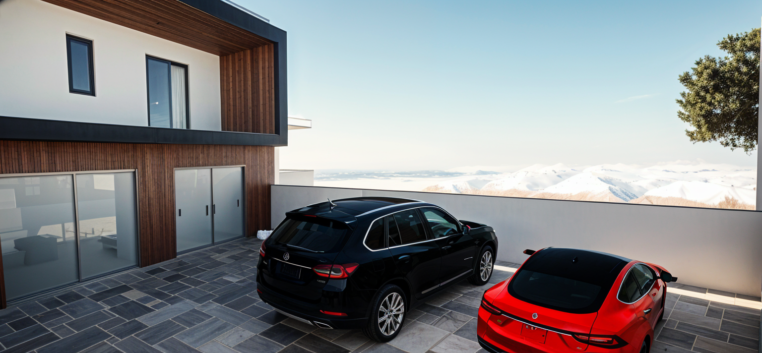 contemporary exterior shot render a modern two story house with large windows black frames and white walls the atmosphere is tranquil and sunny with the light casting soft shadows the swimming pool reflects the clear blue sky surrounding lawn is lush vibrant green include a wooden deck in warm brown tones complementing the sleek outdoor furniture in white the outdoor kitchen area is modern with light beige countertops and wooden accents create a serene and inviting ambiance nature environment two girls playing in front of the pool architecture
