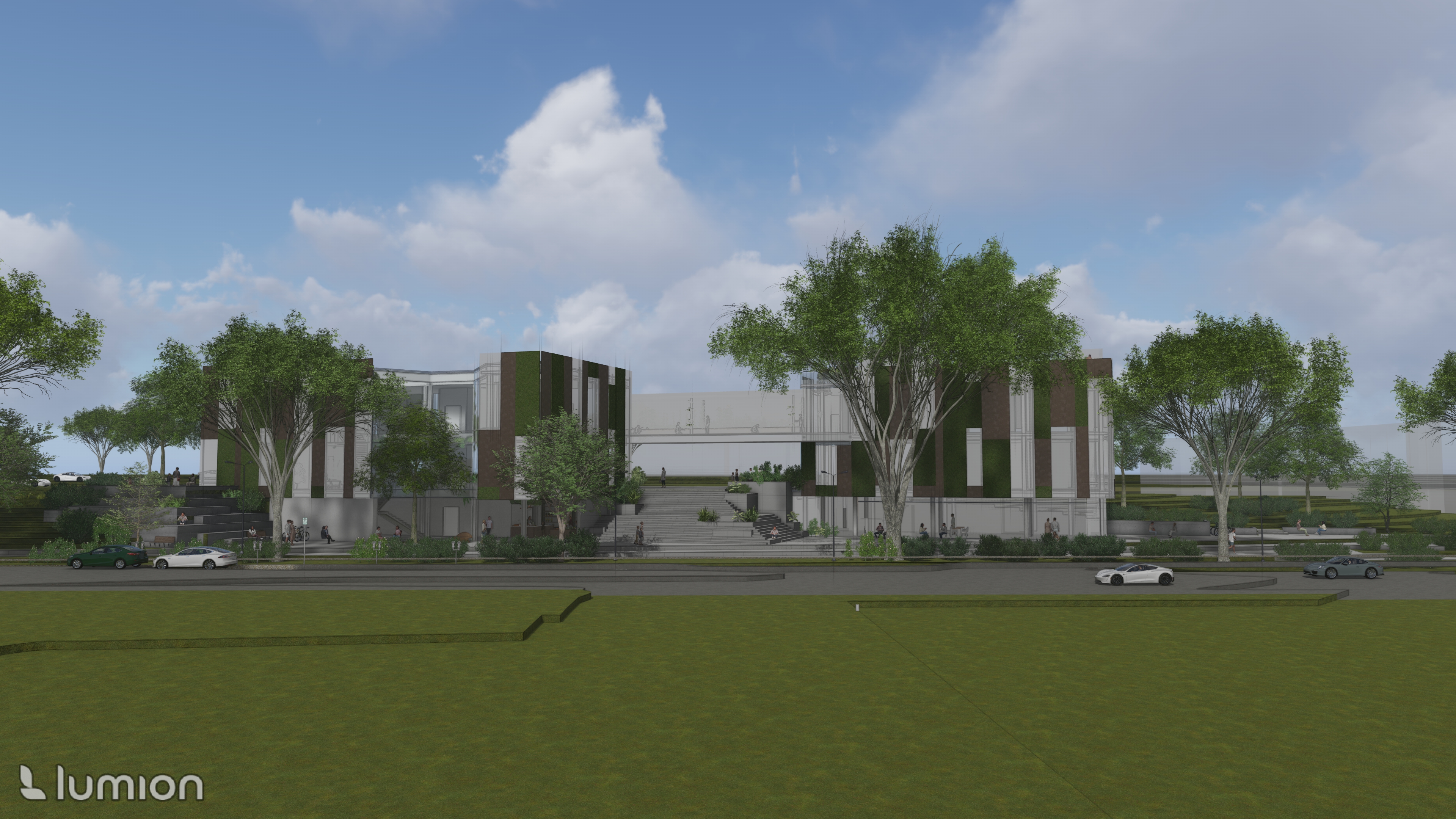 make this into a flat 2d elevation drawing more outlines on the building less of a render quality my professors like a ground line with the building coming straight up from it no perspective view the image is from straight on and the buildings are slightly crooked desaturate the sky make it more of a plain blue watercolor texture make the trees outline light gray vector lines maintain the cars and people but make them match the rest of the style and put the cars at the ground line make the roofline flat maintain the colors on the building but change the opacity maintain the green panels on the building the rooftops are flat make the ground a thin line with no color underneath make the grass on the sides a lighter watercolor texture lighten the sky to a very light watercolor texture make clear vector lines