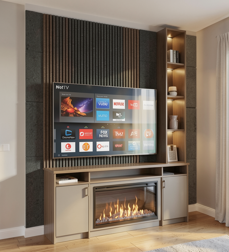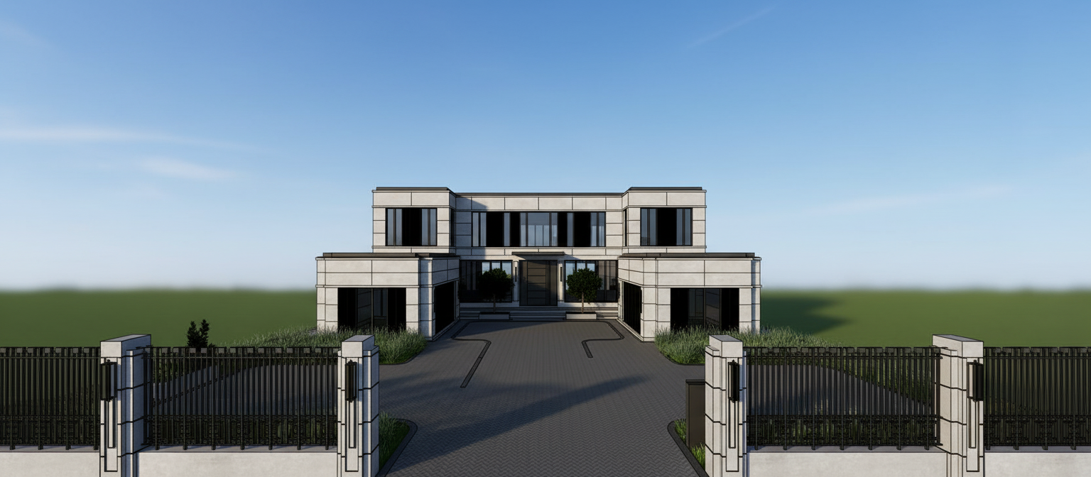 convert this floor plan into a realistic isometric 3d view of a full house show the space from an elevated angle with furniture walls and details visible top down 3d realistic render of two apartments side by side keeping exactly the same layout as the provided 2d plans same walls doors windows and distribution do not modify anything the only difference between both is the kitchen and dining area use light oak wood flooring throughout the whole house including bathrooms with white wall to wall shower trays kitchen with white cabinets and oak wood countertops and island white wardrobes with visible hangers and white interior floor white beds beige rugs and dark green sofas windows in semi transparent blue glass living room with fireplace and tv and full height built in bookshelves with books on both sides include a porch with beige flooring and a barbecue clean modern minimal style soft natural lighting and perfect top down orthographic view use the same furniture as shows on the plan do not change the orientation of the floorplan