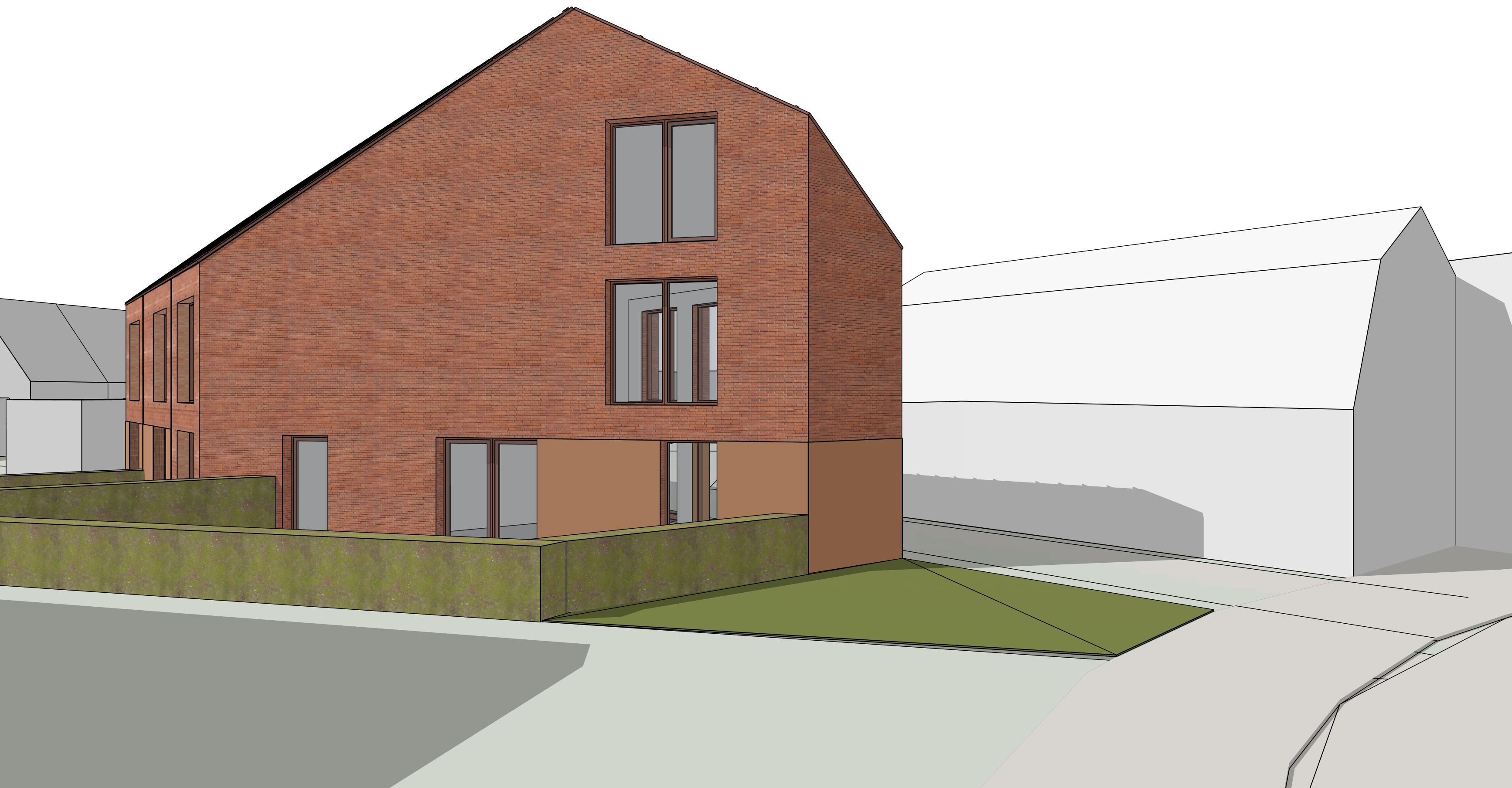 create a warm and inviting residential scene inspired by contemporary dutch architecture the main buildings should feature facades made of red brown mottled brick with window frames in an orange red brown tone behind the designed building on the left side and in front off the building add hedges allow some subtle visibility of modern interior elements through the windows with bedrooms located on the upper floors and a living room on the ground floor adjacent buildings may appear more abstract while still maintaining a sense of neighborhood cohesion and should be entirely bright white to create contrast between the sidewalk and the lower edges of the window frames include a trasraam plinth made of pigmented concrete in the same color as the window frames depict an autumn like day in the netherlands with soft slightly diffused daylight and gentle warm tones on the right side of the scene where the green ground area appears include grass with flowers additionally show a few people walking or cycling to create a calm community oriented atmosphere