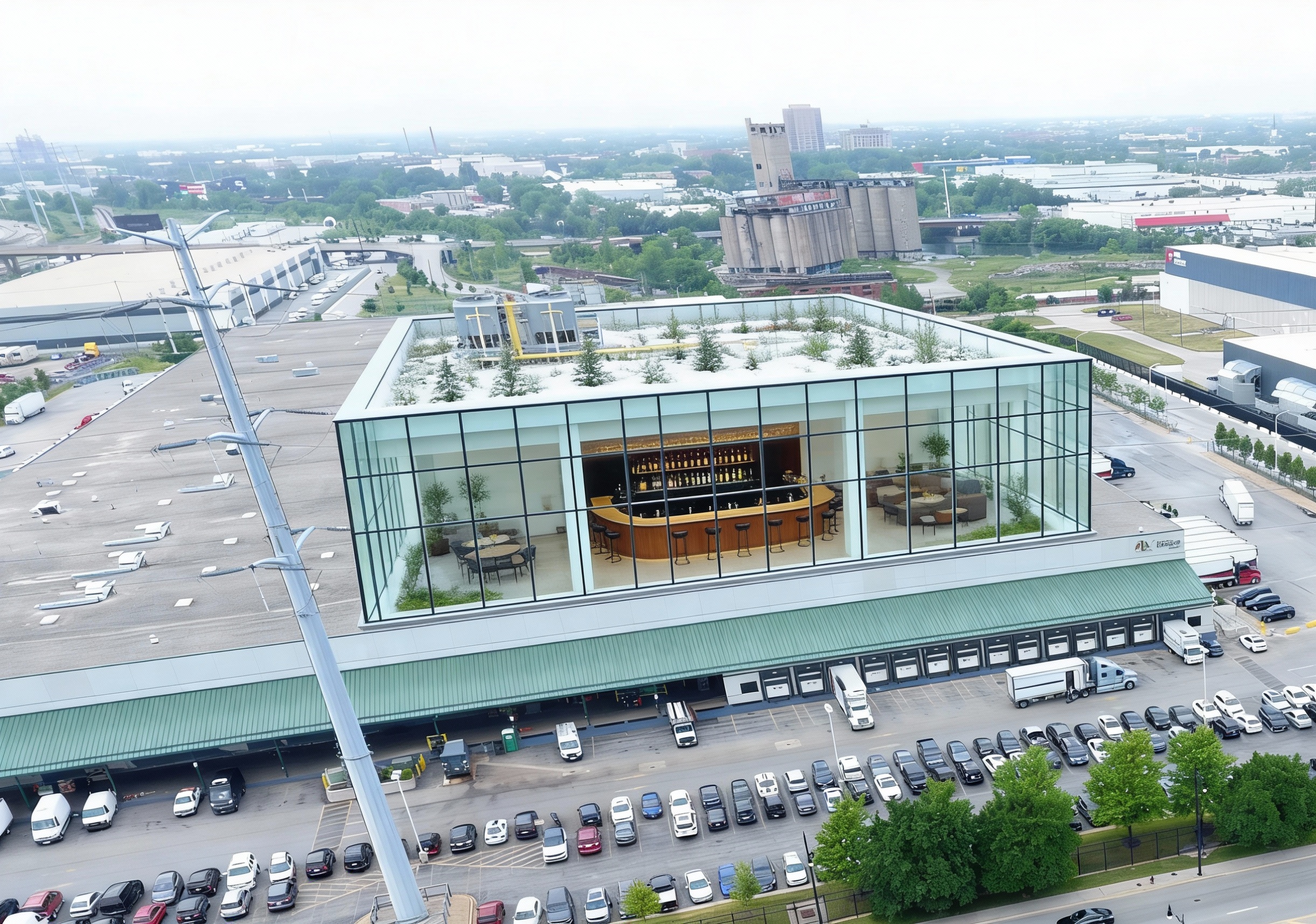 building outlined in red to become a photo realistic indoor winter garden with all glass curtain walls with mullions and a solid white roof include a bar inside the garden and a seating area and lots of greenery do not alter anything in image that is not within the red outline