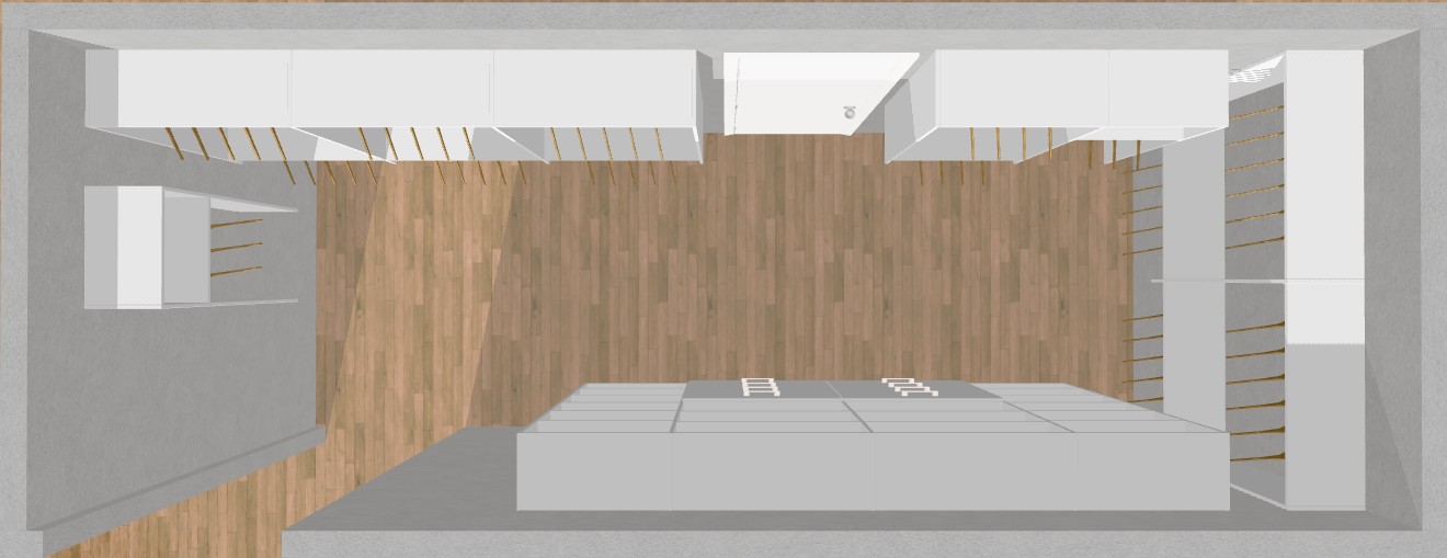 create a top down view of a modern luxurious walk in closet the floor should have a warm rich walnut wood texture creating an inviting atmosphere the cabinetry and shelves should be a sleek glossy white providing a sense of modern elegance the walls should be a soft ivory white adding a touch of sophistication incorporate satin nickel accents on the closet rods and handles for a refined luxurious touch the lighting should be ambient and soft with a warm glow to create a cozy welcoming environment