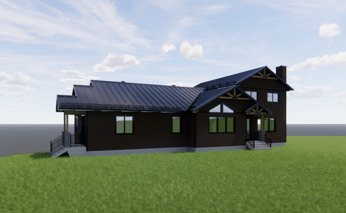 ultra realistic 4k render house in a forest in mont tremblant summer at midday black wooden cladding terrain drops a little bit after the left side balcony