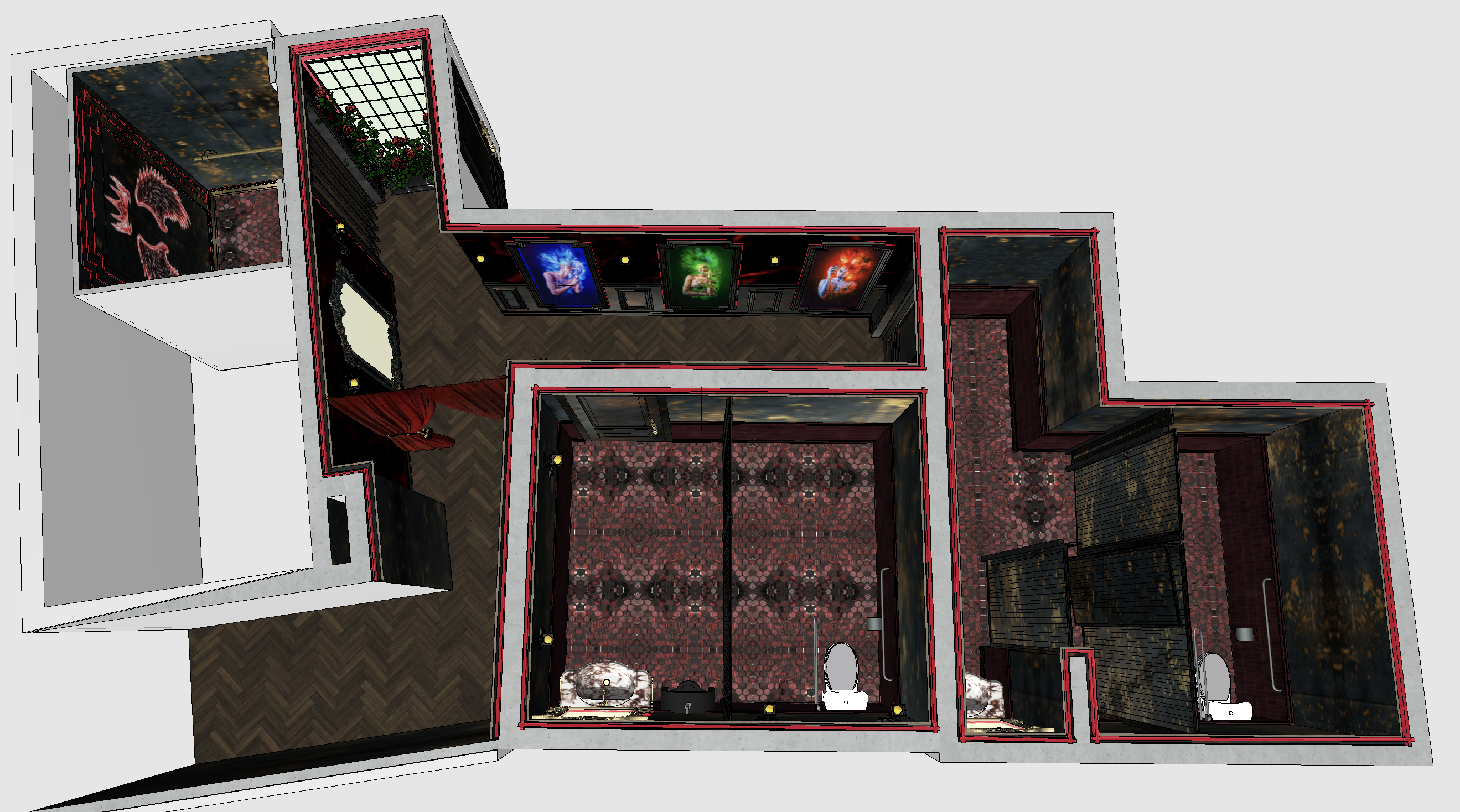 hell concept floor plan visualization v1 1 global prompt lock ultra detailed top view architectural floor plan render of a luxury restaurant interior with a heaven hell concept combining realistic materials with clear spatial organization camera strict top down view 90 orthographic or slight perspective full layout visible no distortion resolution high resolution 8k 2 architectural drawing style style is a hybrid of architectural plan material visualization interior design presentation not a technical cad drawing but a designed presentation floor plan 3 geometry clarity clean wall outlines readable layout correct proportions no warped geometry all rooms clearly defined 4 space organization the plan includes elevator feature entrance element transition corridor gallery wall zone art panels with sins restroom areas male female or split cabins circulation paths flow is clearly readable 5 color concept control palette follows hell zone identity black deep burgundy red neon accents gold textures each zone visually connected 6 wall treatment walls shown with material identity dark decorative plaster gold textured accents red glowing perimeter lines walls outlined with continuous red neon style lines emphasizing geometry 7 feature elements identification key elements visible in plan elevator cabin with neon wall graphic wings crown gallery wall with 3 framed artworks sins restroom layouts with fixtures mirror zones partitions all readable from top view 8 floor materials different materials clearly defined main corridor wood parquet herringbone pattern restroom burgundy black mosaic tile elevator darker textured flooring materials must be visually distinguishable 9 lighting indication lighting shown conceptually red perimeter glow along walls neon frame zones highlighted subtle ambient lighting cues no heavy shadows readability first ceiling indication optional layer ceiling concept subtly hinted mirrored ceiling areas reflected tone red led perimeter lighting but not overpowering the plan 1 1 material realism even in plan view parquet shows real wood grain mosaic has texture plaster has depth neon appears as soft glow 1 2 line weight graphics outer walls slightly thicker inner partitions lighter clean edges minimal noise readable and professional 1 3 atmosphere control unlike renders no cinematic shadows no dramatic blur clean presentation focus clarity material identity 1 4 ai anti render block avoid perspective distortion messy textures over dark image unrealistic glow clutter 1 5 final ai control block final result must look like a high end architectural presentation floor plan with realistic materials and a strong hell themed design identity clean readable and visually striking