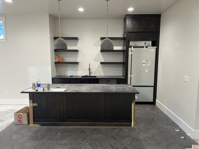 do not change the cabinets in any way preserve the exact cabinet colors materials finishes dimensions door and drawer styles hardware spacing alignment and all geometry exactly as shown do not alter the countertop shape backsplash appliances flooring lighting fixtures or wall structure only remove the construction materials clutter and mess from the scene clean the room and make it look finished and staged add a few simple tasteful home accessories appropriate for the style of the space but do not add or remove any furniture windows or architectural elements maintain the original lighting direction and realism enhance clarity and polish the photo while keeping the cabinetry and room design completely unchanged do not alter the lighting to keep the cabinet colors as they are in the image add new flooring turn the lights on add a subzero built in fridge change the countertops to black marble stage for a luxurious wet bar add stools to the island