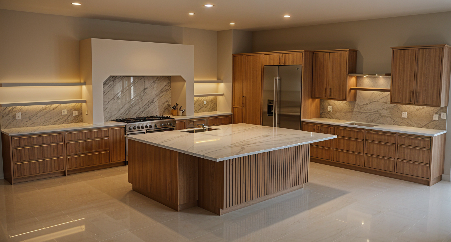 a modern kitchen with light oak wooden cabinets and a large island include sleek stainless steel appliances and a beige marble countertop for the island blacksplash and countertops use warm ambient lighting for a cozy atmosphere complement with soft white flooring for balance create a bright and welcoming ambiance with soft natural lighting no outlets on the backsplash architecture