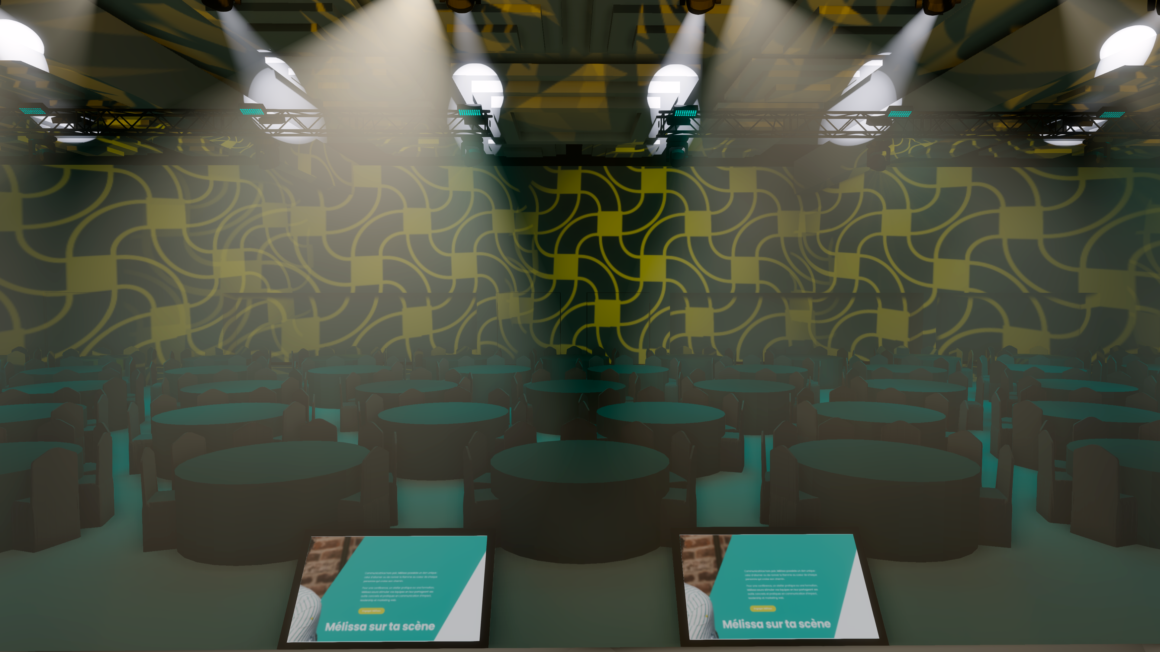 use the current image as a locked base reference do not modify stage layout architecture or camera angle any physical items stage truss chairs floor walls tables lighting fixture positions or types led screen content image curvature or color palette floor and ceiling materials and base tones table colors and turquoise lighting exactly as in the original image led screen keep the exact same image and colors screen is curved dimensions 115 wide x 12 high no resizing no movement no reinterpretation ceiling lighting non negotiable ceiling remains yellow but significantly darker entire ceiling fully covered with yellow gobo projection gobos must be deep saturated low luminance overall ceiling exposure reduced visible light beams required slightly subdued beams originate from existing fixtures gobos and beams add texture and depth not brightness no new colors introduced lighting exposure overall room remains dark and controlled ambient light reduced further turquoise table lighting unchanged screen remains the primary visual focus additions only add seated participants in the existing chairs audience composition 50 men 50 women younger average age 25 40 entrepreneur startup crowd casual professional attire audience density realistic not packed add one single presenter on stage centered neutral posture mood entrepreneur conference business summit dark moody architectural conference atmosphere not concert absolute rule anything not explicitly listed above must remain identical to the original image