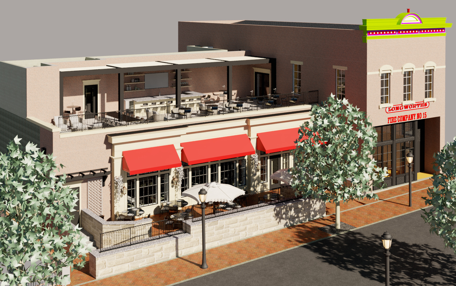 strict maintain exact building geometry massing proportions openings materials layout and camera perspective from the input revit model do not alter structure roofline window door locations patio layout or site walls project adaptive reuse of historic firehouse longworth s fire company no 15 in mount adams cincinnati ohio preserve entire existing structure including original firehouse and rear addition material intent all primary wall surfaces are existing red brick matching the reference photo aged cincinnati brick varied tone subtle weathering cream tan elements are painted exterior trim only window surrounds cornice banding not stucco or eifs no new wall materials introduced context match reference image closely sloped mount adams street condition with slight uphill grade brick paver sidewalk at building frontage low stone retaining wall with iron railing above mature street trees partially obscuring fa ade important adjacent buildings tight to sides urban hillside fabric black street lamps subtle historic character parallel street parking site patio maintain raised patio condition exactly as modeled black metal railing at patio edge outdoor dining with neutral umbrellas and simple furniture clean but slightly lived in not staged or perfect architecture details preserve historic firehouse fa ade proportions and detailing signage integrated cleanly no oversized or fake signage large storefront glazing at ground level with realistic reflections upper windows maintain original proportions and trim lighting early evening golden hour warm interior lighting visible through windows soft exterior accent lighting on brick and signage natural shadows consistent with street trees atmosphere photorealistic grounded true to life cincinnati urban hillside environment slight depth haze no stylization no exaggerated effects do not do not suburbanize the setting do not add parking lots or open space do not change materials do not clean up or modernize surrounding buildings excessively critical preserve all awnings exactly as modeled do not remove simplify resize or reinterpret awnings maintain their exact placement projection angle and bright red fabric material
