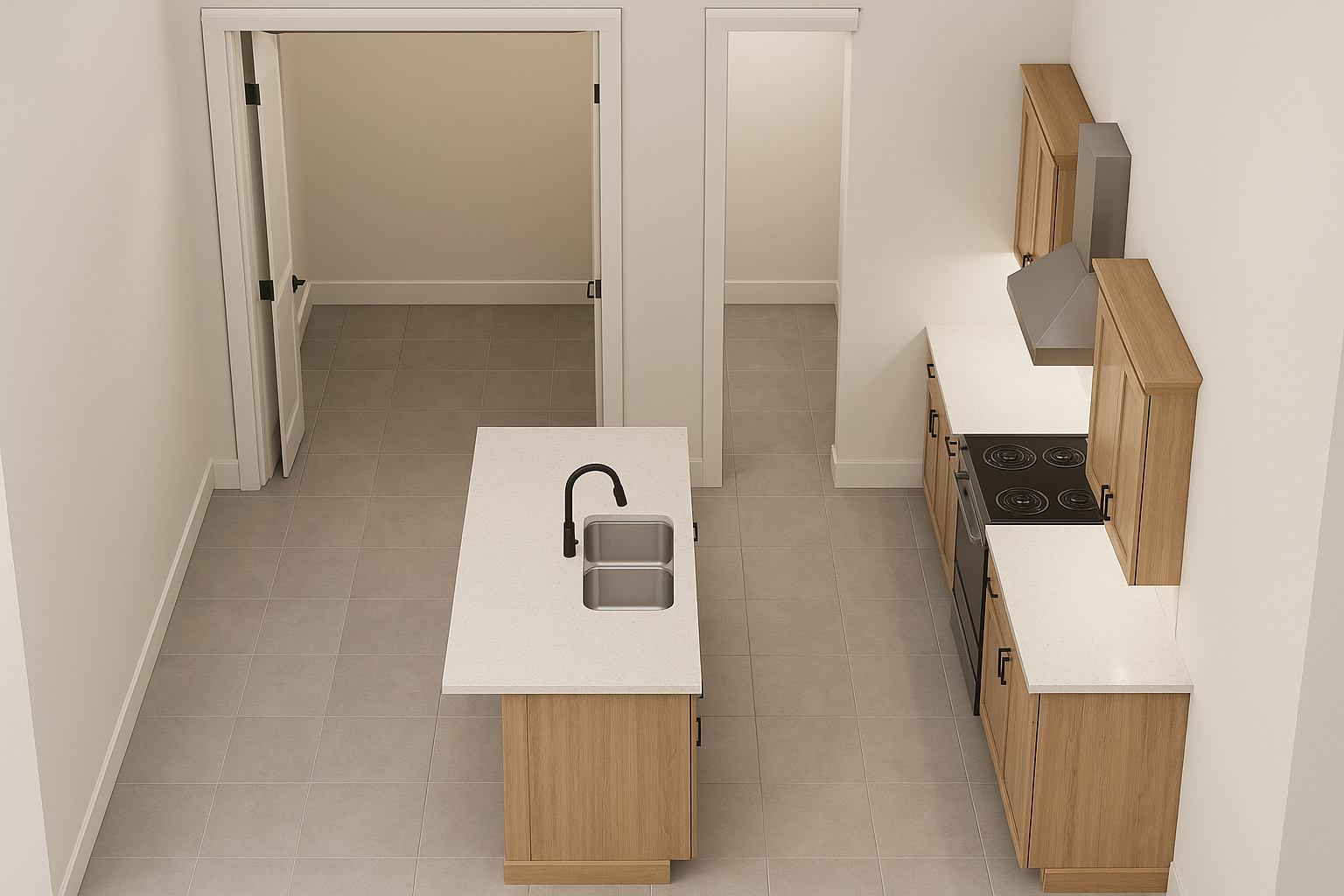 the flooring should be a beige herringbone parquet add realistic accessories to the furniture such as glasses and tableware inside the cabinets on the ceiling where the black line is visible there should be a recessed suspended ceiling with integrated led lighting please also place elegant plates and dinnerware on the table the overall goal is to make the visualization look highly realistic and professional