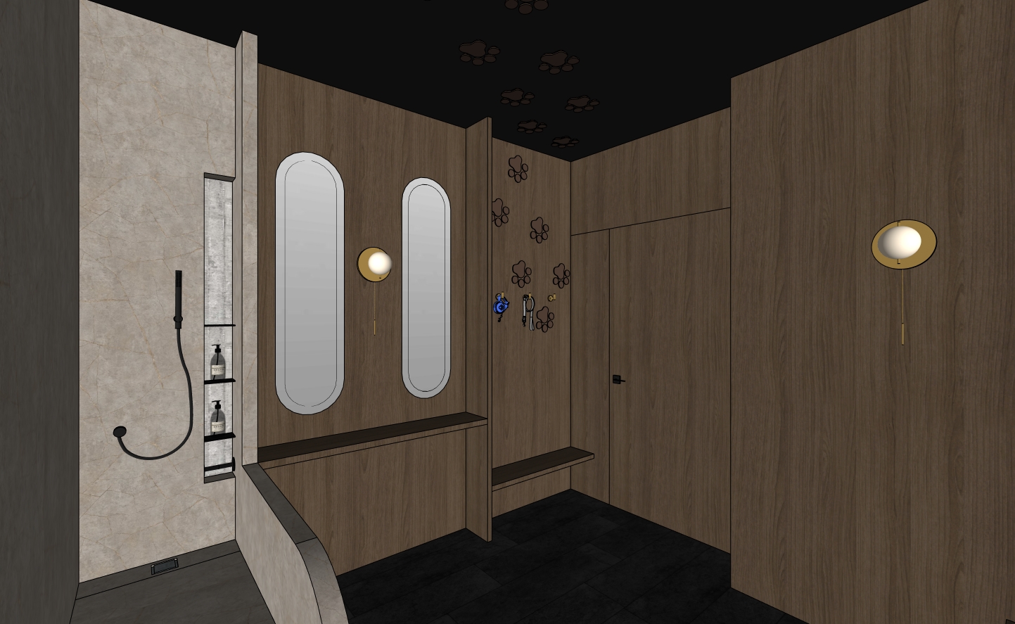 render a stylish entryway with a modern and cozy atmosphere the walls are covered in rich dark walnut wood panels add two large elegant mirrors with sleek silver frames the light fixtures are glowing warm white providing soft illumination a chic stone accent wall is in a textured natural gray include a luxurious black tiled floor with subtle hints of charcoal enhancing the depth highlight minimalist black fixtures for a contemporary touch add playful decorative elements shaped like paws on the ceiling keep the lighting ambient and inviting