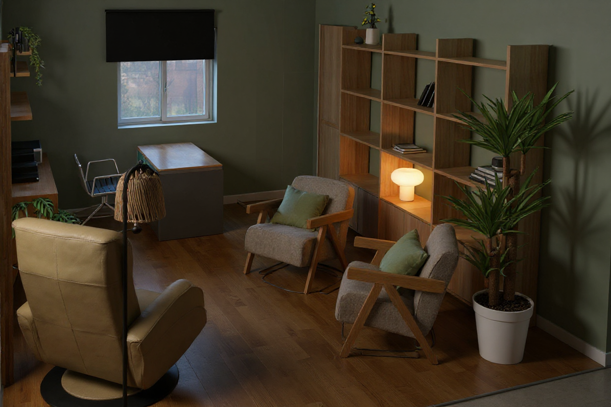 convert this floor plan into a realistic isometric 3d view of a office show the space from an elevated angle with furniture walls and details visible use the same furniture as shows on the plan do not change the orientation of the floorplan