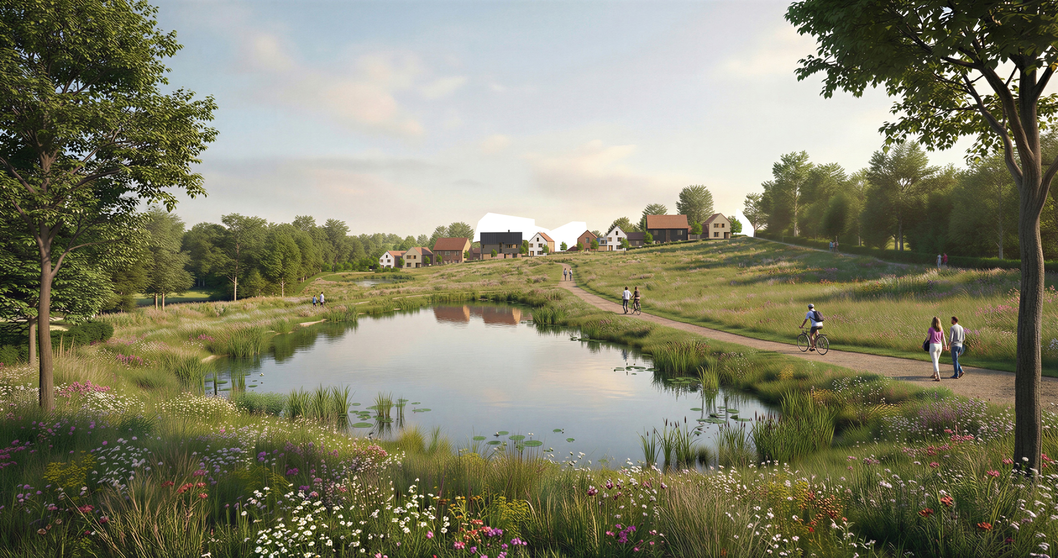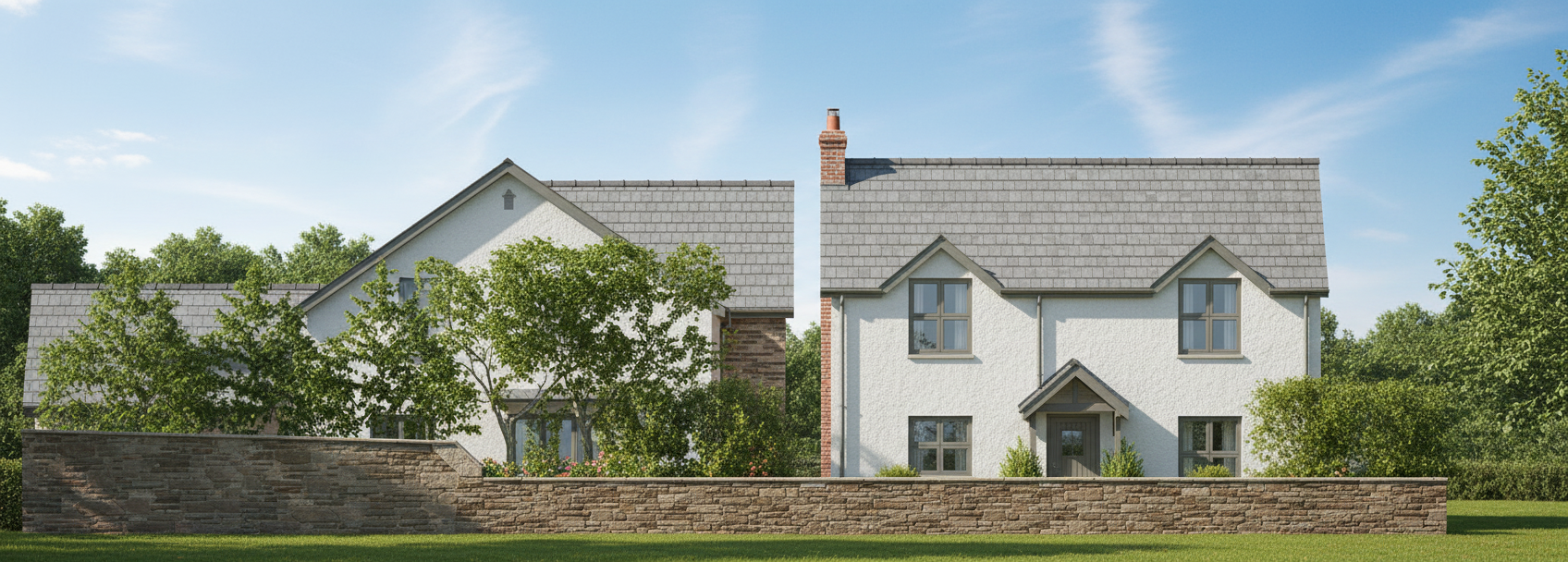 stitch together this image and make the houses look realistic and the planting look appropriate