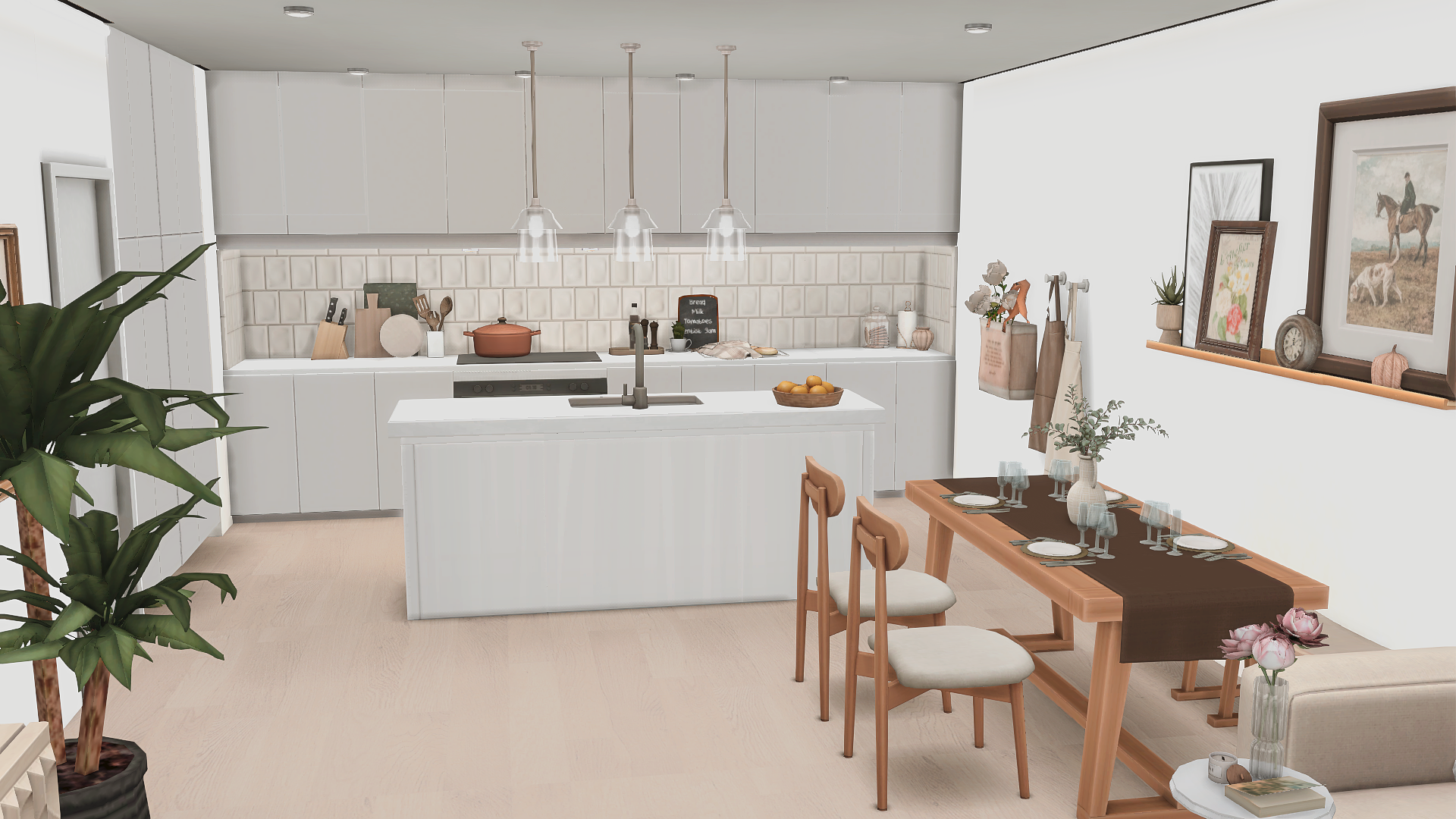 turn this image to a hyperrealist photo keep the same layout of this modern kitchen with open space increase the resolution textures and the realism keep ceiling and walls white and use natural light from the spotlights and lamps the room doesn t has windows or doors a continuous recessed perimeter shadow gap 15 30 mm runs exactly at the junction between the ceiling and all walls do not add this gap above the wall cabinets and the tall cabinets in this gap runs led natural light as well keep the decorations as is just increase the realism and textures