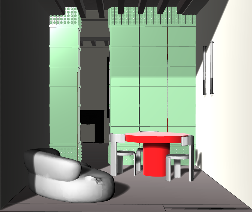 muri rosso scuro lucido come il mobile colorato di verde il soffitto compreso le travi giallo senape a terra pavimento ini parquet rovere divano a sinistra in velluto rosa tavolo in acciaio spazzolato e piano in legno di ciliegio sedie laccate nere atmosfera con luci calde soffuse