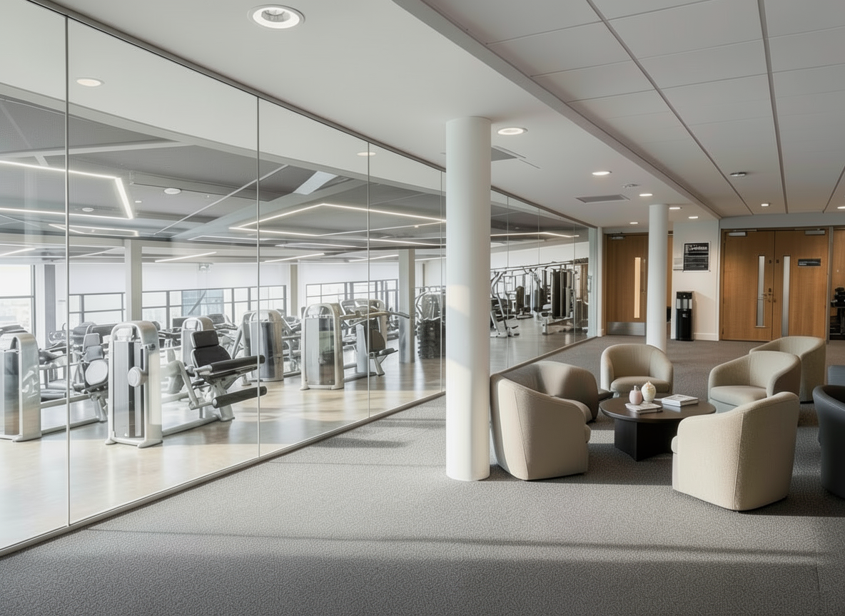 keep the existing lounge seating arrangement between the structural columns unchanged add a couple of small indoor plants near the seating area to enhance warmth and relaxation use modern planters with neutral or muted tones that complement the carpet and furniture place plants naturally beside chairs or at the edges of the seating zone without obstructing circulation maintain all existing materials flooring carpet glass curtain wall lighting reflections and gym interior unchanged preserve casual cozy modern minimalist aesthetic ultra realistic rendering high detail architectural visualization