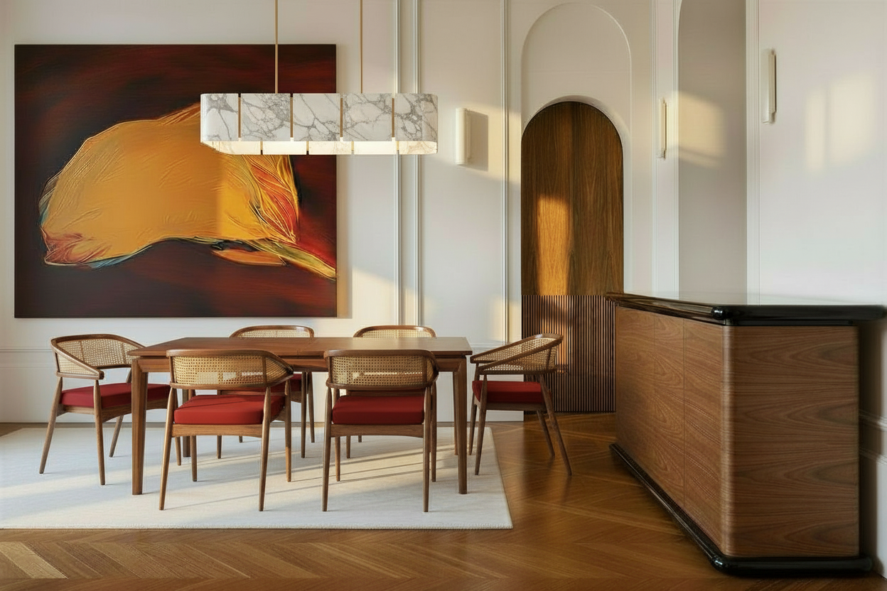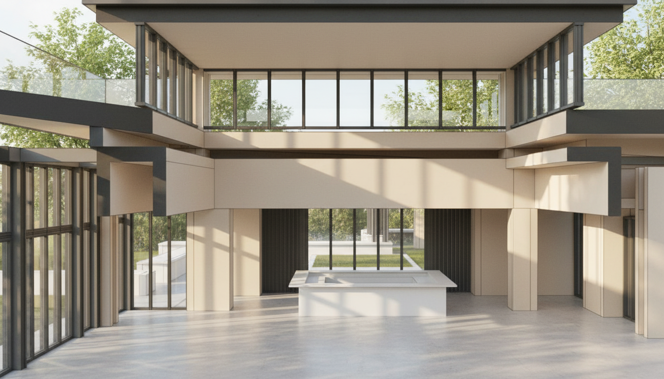 a spacious modern hall with a sleek arched ceiling the ceiling is a soft off white illuminated with hidden warm led lights casting a gentle glow the walls are adorned in a sophisticated light wood paneling creating an inviting atmosphere large floor to ceiling black framed windows line the perimeter flooding the room with natural light the floor is a smooth elegant gray concrete adding a contemporary touch the ambiance is serene and airy perfect for a minimalist yet luxurious setting