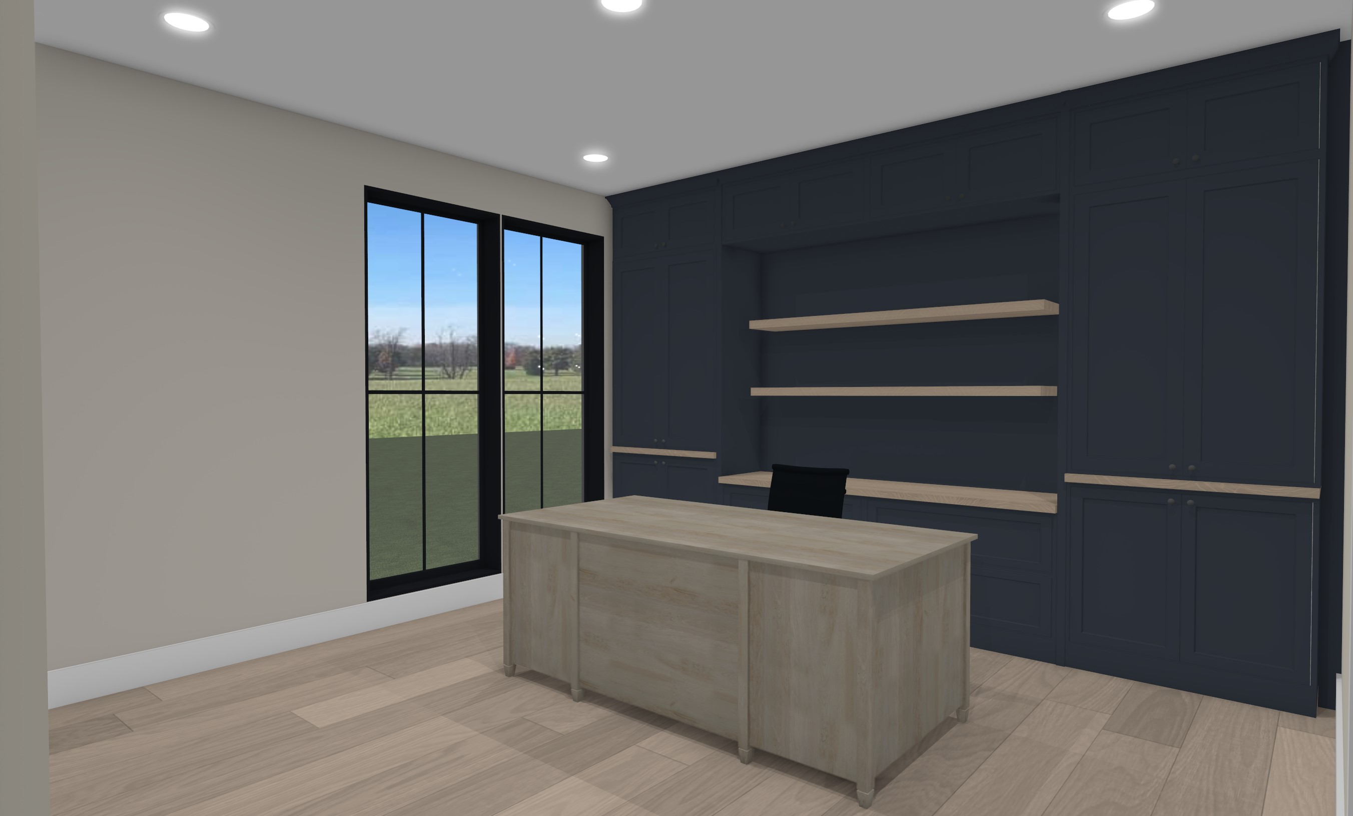 make this image a photograph of a mans office add an area rug and some staging to the shelves