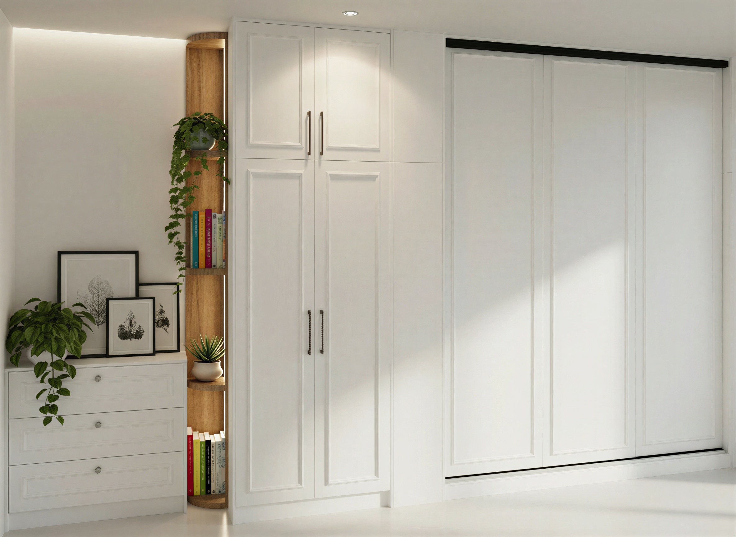 this image is a high quality 3d architectural visualization cgi while it is visually appealing and clean several technical markers distinguish it from an authentic photograph 1 lighting and shadows the spotlight effect the light hitting the top of the wardrobe is too perfect in a real photo you would see more light scatter or lens flare and the transition between light and dark on the white surface would be less uniform ambient occlusion the shadows in the corners and where objects meet like the picture frames on the dresser are very smooth real world shadows usually have more noise or slight irregularities based on the room s secondary light sources 2 texture and perfection surface consistency the white panels are mathematically flawless real furniture even when brand new shows micro textures slight reflections of the surrounding room or tiny dust particles when caught by direct light organic elements the plants are the biggest giveaway the leaves have a repetitive plastic sheen and lack the natural imperfections slight color variations wilted edges or varying thickness found in living plants 3 structural geometry flushed joins the way the wardrobe meets the ceiling and the floor is to the millimeter in real construction there is almost always a small gap a bead of caulk or a crown molding to hide the inevitable unevenness of a ceiling book spines the books on the shelves look like flat textures mapped onto boxes they lack the physical depth and individual wear and tear of real paper and cardboard summary the realism is excellent for design presentation purposes it successfully communicates the aesthetic and spatial layout however it lacks the visual grit and entropy that our eyes associate with a lived in physical environment