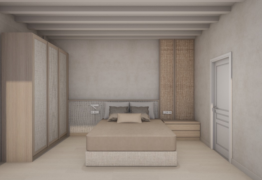 create a highly realistic render of an interior bedroom with a calm and serene atmosphere the headboard is upholstered in a light beige linen fabric creating a soft and elegant focal point on the right side the tall headboard section features a luxurious rattan texture create a realistic and professional render of a bedroom with a calm and atmospheric mood the lighting should feel balanced and natural enhancing the realism of the materials the bed is dressed with linen sheets and a coverlet in earthy tones with character the bedding palette includes broken white and beige linen fabrics while the coverlet is a beige linen tone adding subtle depth and contrast the fabrics look high quality refined and luxurious ultra realistic render high resolution professional interior design photography style keep the design exactly as it is