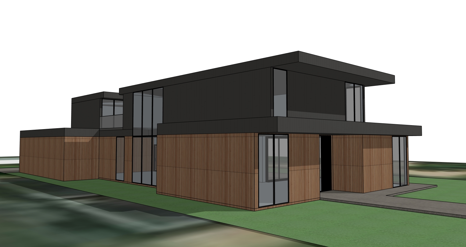 home is in a mature uppscale residential neighbourhood amongst large older homes there are a handful of very large mature oak and elm trees in the foreground and backgournd setting is just before dusk there should be some very modern short landscaping shown