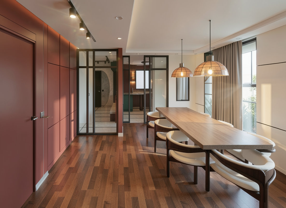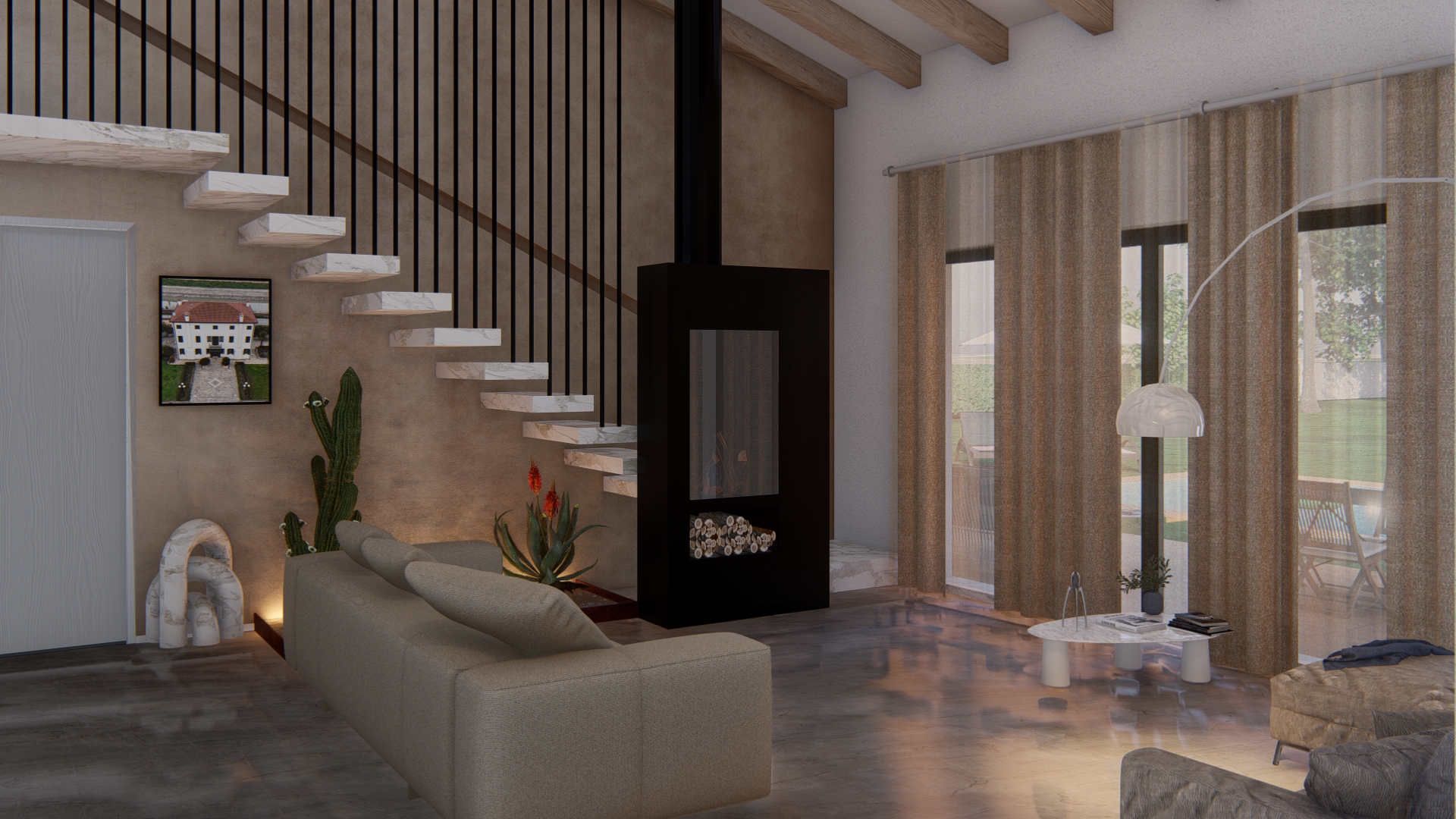 transform this image at night increase the internal light which must be a relaxing warm light the floor is made of light marble with some grain the sofas are made of light fabric and the one near the fireplace is made of beige leather make the fireplace more truthful add the flame and make the glass more truthful the color of the fireplace is matte black remove the curtains add a light coming from the stairs