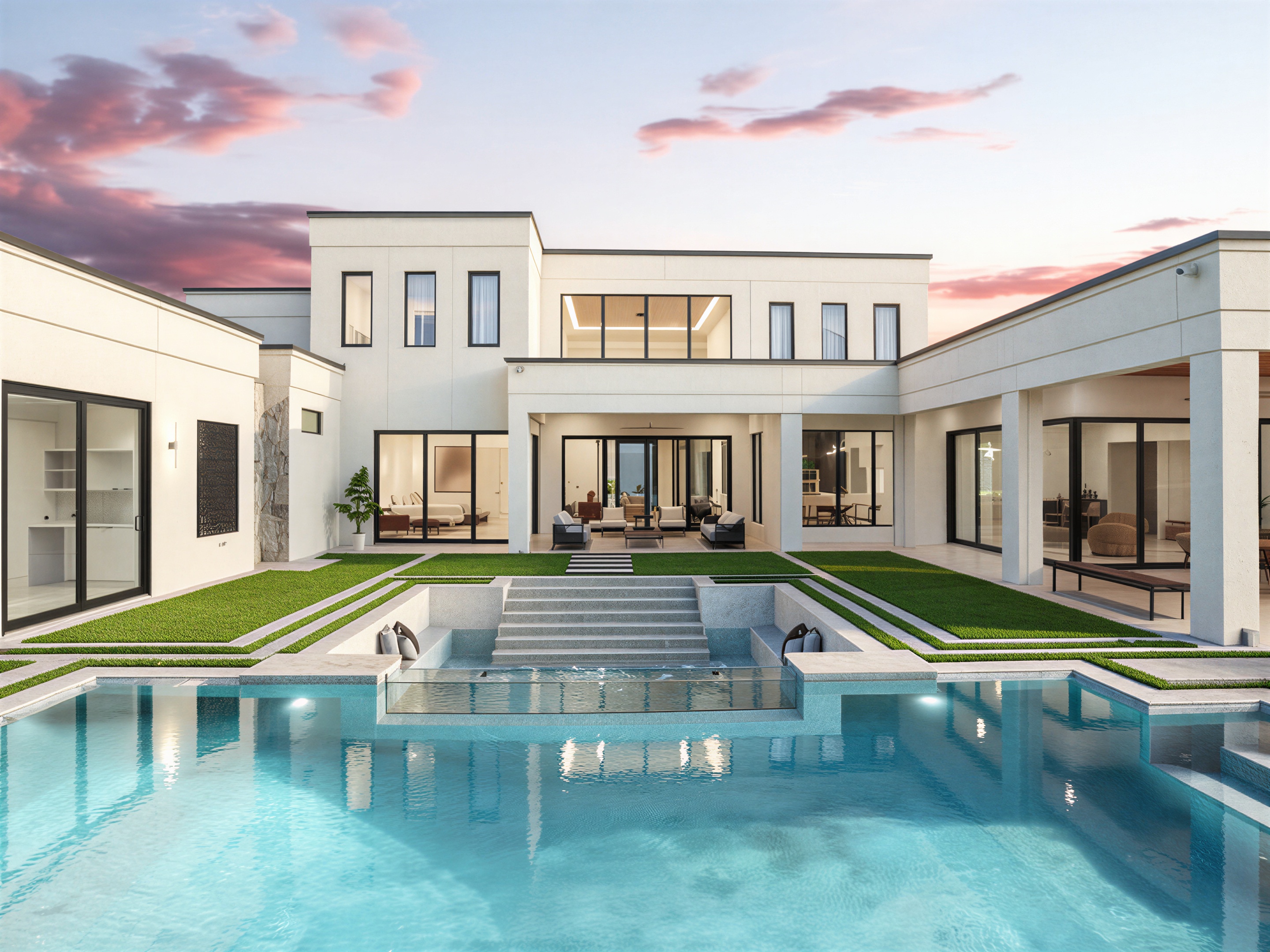 replace the sky with a natural blue sky with a few soft white clouds keep the architecture pool landscaping lighting and camera angle exactly the same only improve the sky to look realistic and clean