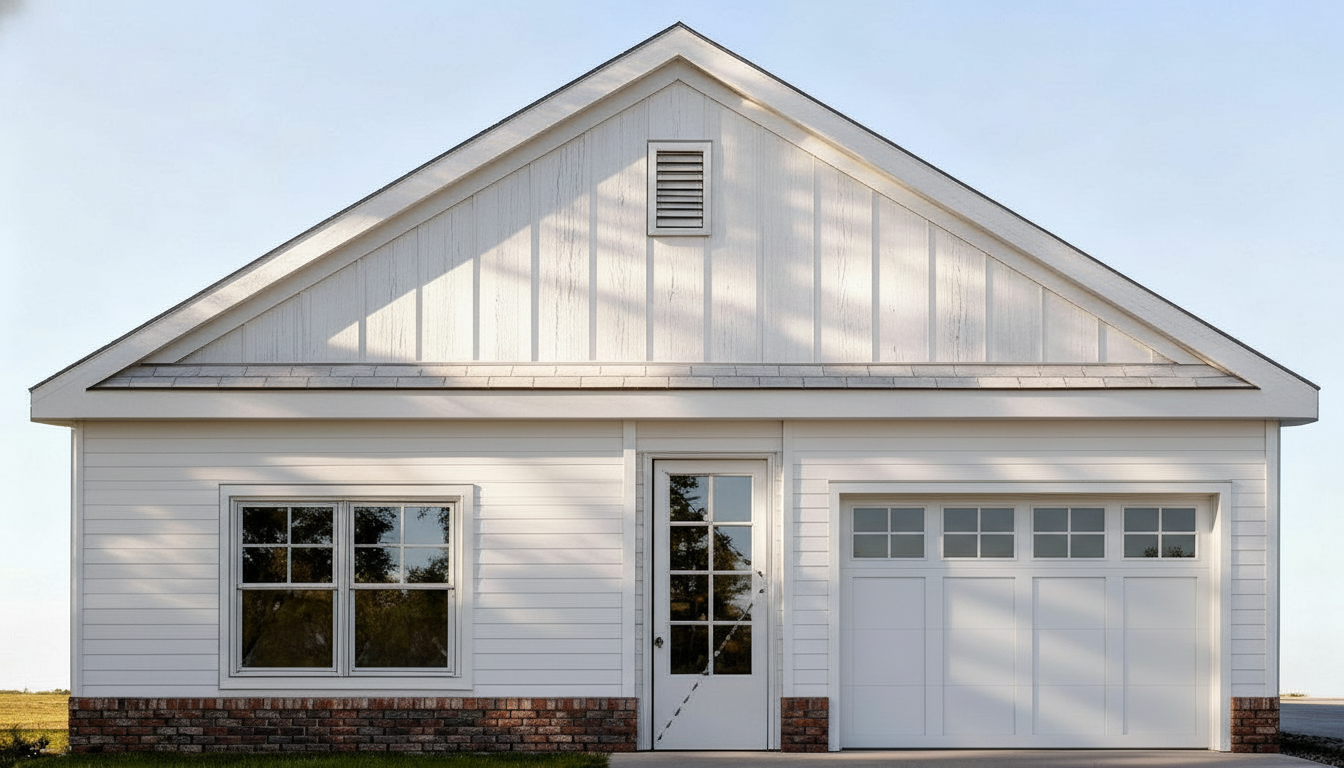 render in white in a farmhouse style garage door in white with grids